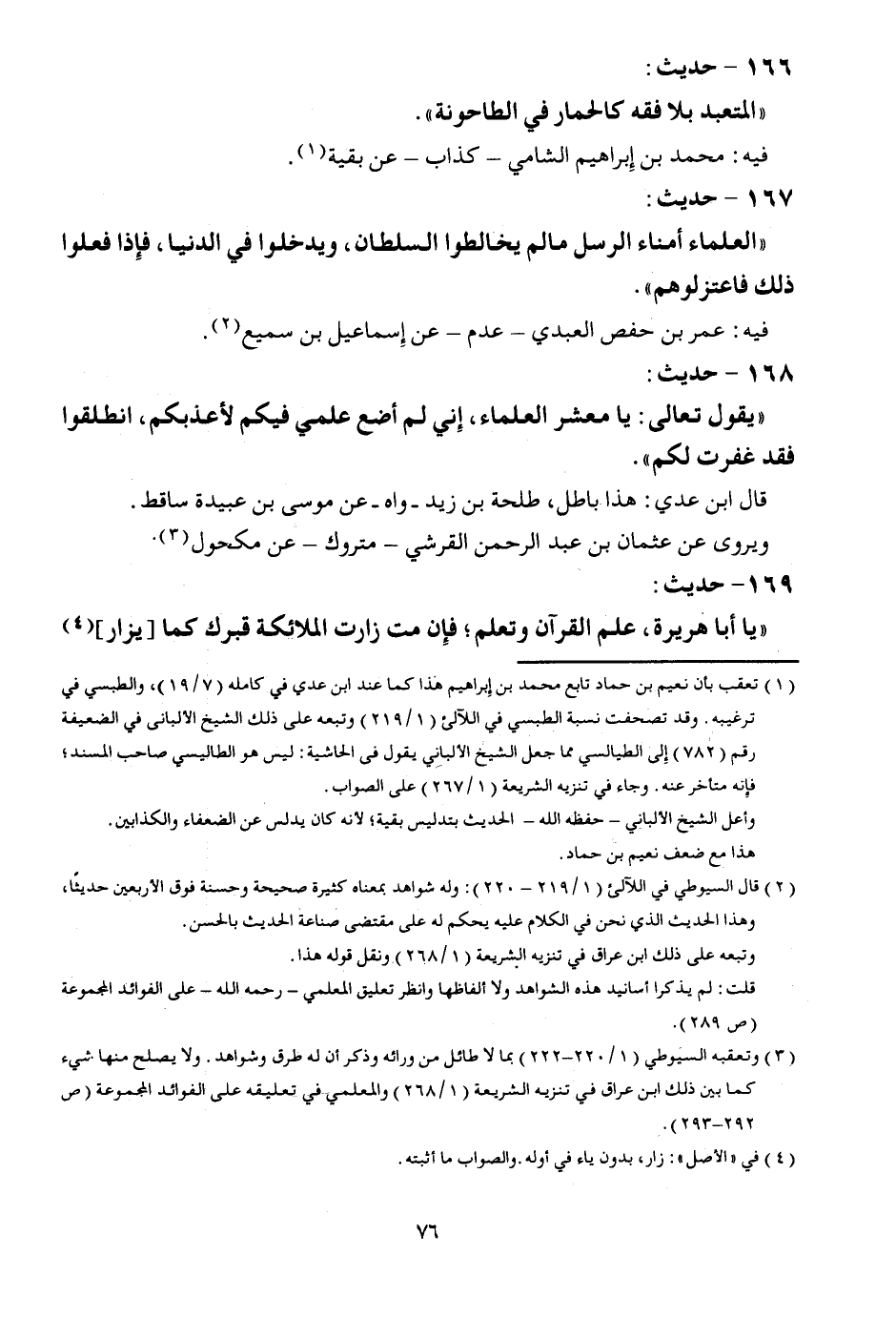 168 - حَدِيث: " يَقُول تَعَالَى: يَا معشر الْعلمَاء، إِنِّي لم أَضَع علمي فِيكُم لأعذبكم، انْطَلقُوا فقد غفرت لكم ". قَالَ ابْن عدي: هَذَا بَاطِل، طَلْحَة بن زيد - واه - عَن مُوسَى بن عُبَيْدَة سَاقِط. ويروى عَن عُثْمَان بن عبد الرَّحْمَن الْقرشِي - مَتْرُوك - عَن مَكْحُول.