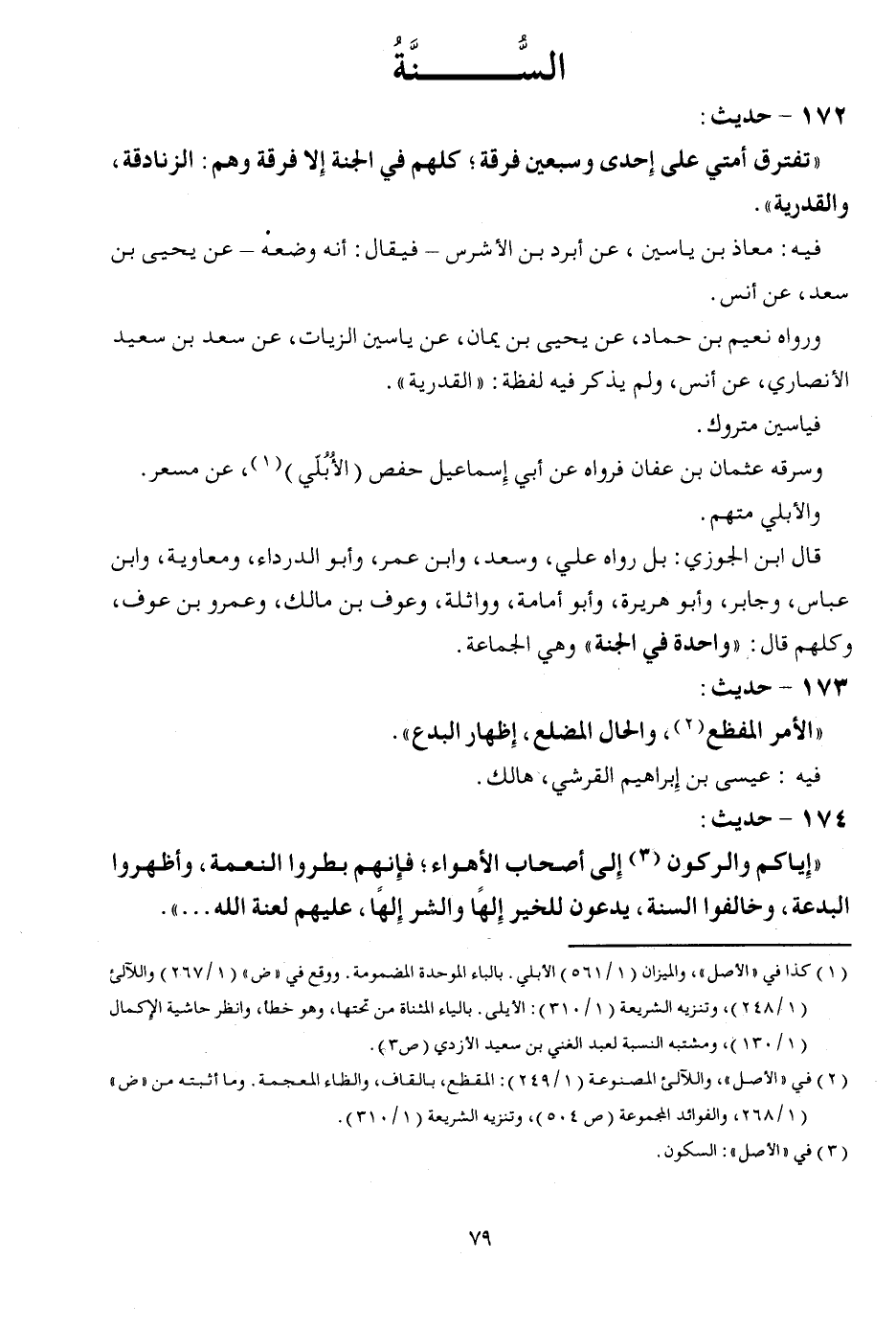 172 - حَدِيث: " تتفرق أمتِي على إِحْدَى وَسبعين فرقة؛ كلهم فِي الْجنَّة إِلَّا فرقة وهم: الزَّنَادِقَة، والقدرية ". فِيهِ: معَاذ بن ياسين، عَن أبرد بن الأشرس - فَيُقَال: أَنه وَضعه - عَن يحيى بن سعد، عَن أنس. وَرَوَاهُ نعيم بن حَمَّاد، عَن يحيى بن يمَان، عَن ياسين الزيات، عَن سعد بن سعيد الْأنْصَارِيّ، عَن أنس، وَلم يذكر فِيهِ لَفْظَة: " الْقَدَرِيَّة ". فياسين مَتْرُوك. وَسَرَقَهُ عُثْمَان بن عَفَّان فَرَوَاهُ عَن أبي إِسْمَاعِيل حَفْص (الأُبُلّي) ، عَن مسعر. والأبلي مُتَّهم. قَالَ ابْن الْجَوْزِيّ: بل رَوَاهُ عَليّ، وَسعد، وَابْن عمر، وَأَبُو الدَّرْدَاء، وَمُعَاوِيَة، وَابْن عَبَّاس، وَجَابِر، وَأَبُو هُرَيْرَة، وَأَبُو أُمَامَة، وواثلة، وعَوْف بن مَالك، وَعَمْرو بن عَوْف، وَكلهمْ قَالَ: " وَاحِدَة فِي الْجنَّة " وَهِي الْجَمَاعَة.