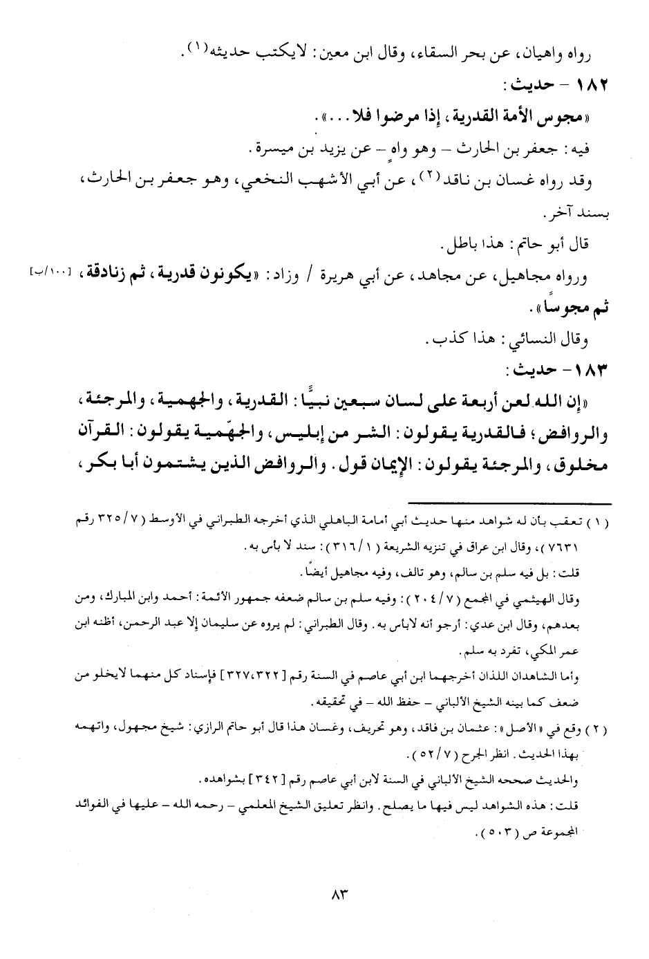 - حَدِيث: " مجوس الْأمة الْقَدَرِيَّة، وَإِذا مرضوا فَلَا ... . . ". فِيهِ: جَعْفَر بن الْحَارِث - وَهُوَ واهٍ - عَن يزِيد بن ميسرَة. وَقد رَوَاهُ غَسَّان بن ناقد، عَن أبي الْأَشْهب النَّخعِيّ، وَهُوَ جَعْفَر بن الْحَارِث، بِسَنَد آخر. قَالَ أَو حَاتِم: هَذَا بَاطِل. وَرَوَاهُ مَجَاهِيل، عَن مُجَاهِد، عَن أبي هُرَيْرَة / وَزَاد: " يكونُونَ قدرية، ثمَّ زنادقة، ثمَّ مجوساً. وَقَالَ النَّسَائِيّ: هَذَا كذب.