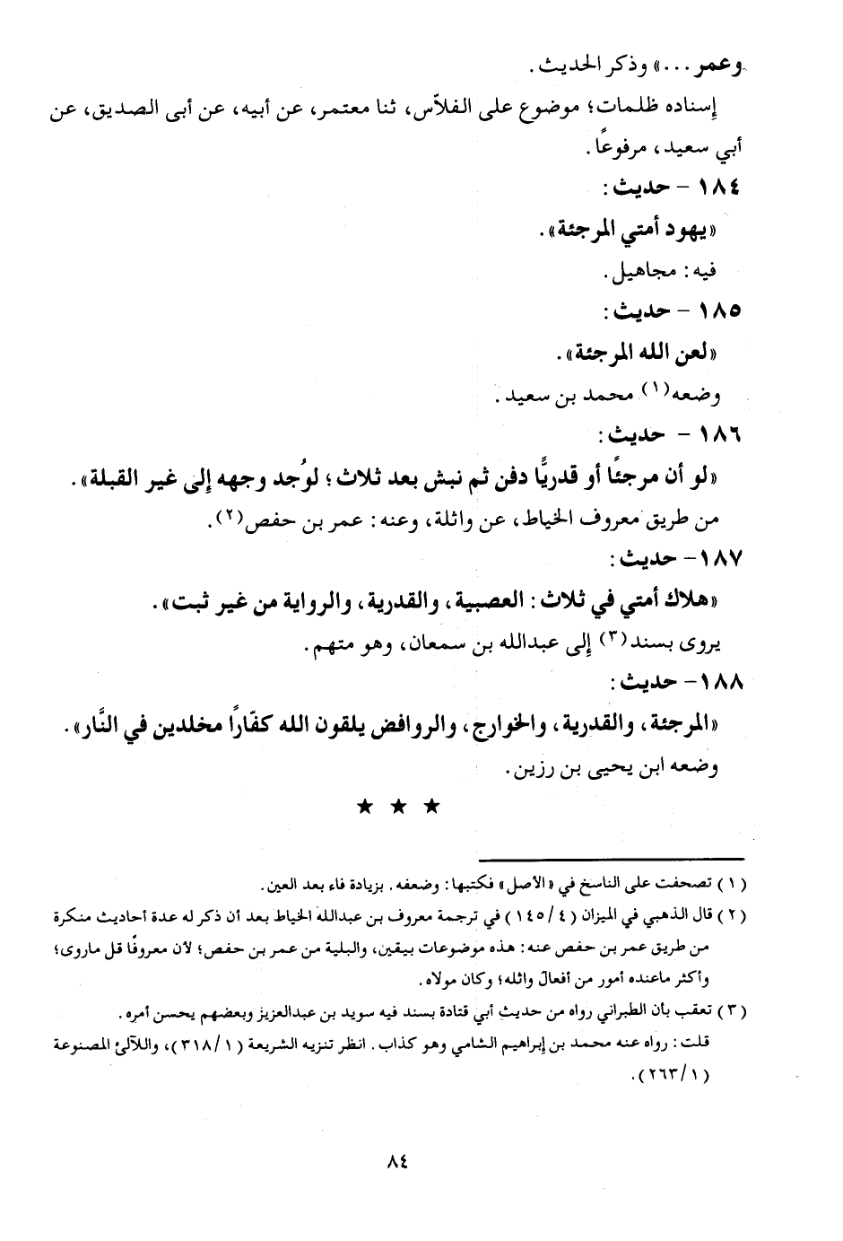 188 - حَدِيث: " المرجئة، والقدرية، والخوارج، وَالرَّوَافِض يلقون الله كفَّارًا مخلدين فِي النَّار ". وَضعه ابْن يحيى بن رزين.