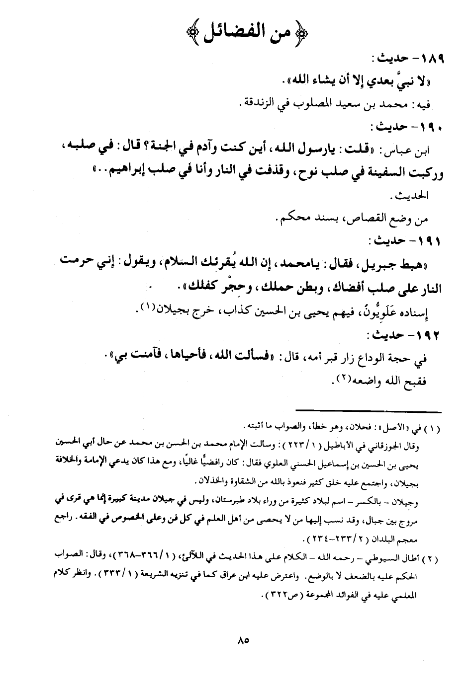 191 - حَدِيث: " هَبَط جِبْرِيل، فَقَالَ: يَا مُحَمَّد، إِن الله يُقْرِئك السَّلَام، وَيَقُول: إِنِّي حرمت النَّار على صلب أفضاك، وبطن حملك، وَحجر كفلك ". إِسْنَاده علويون، فيهم يحيى بن الْحُسَيْن كَذَّاب، خرج بجيلان.