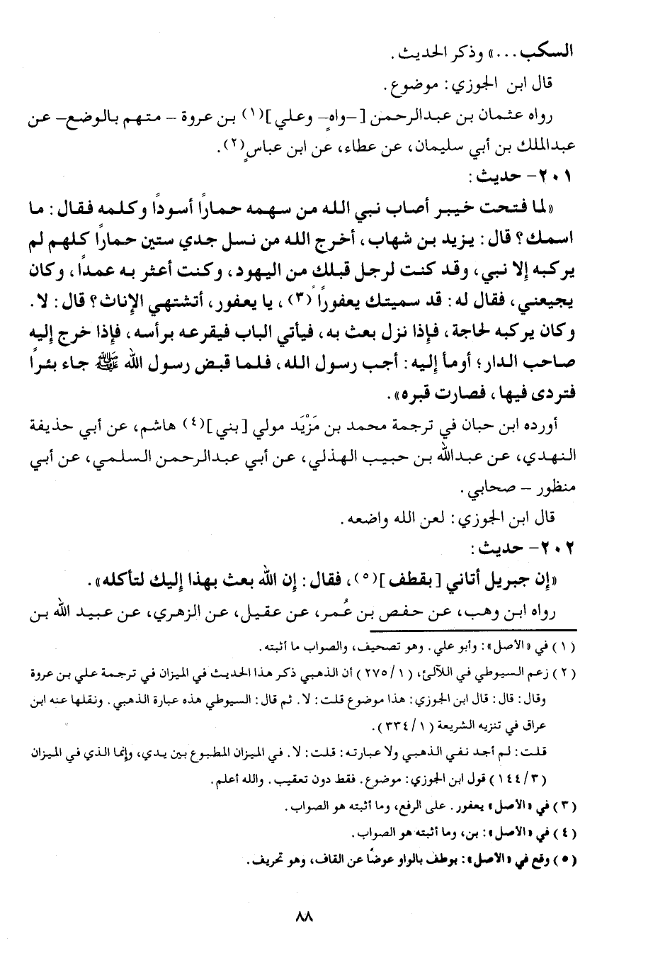 201 - حَدِيث: " لما فتحت خَيْبَر أصَاب نَبِي الله من سَهْمه حمارا أسوداً وَكَلمه فَقَالَ: مَا اسْمك؟ قَالَ: يزِيد بن شهَاب، أخرج الله من نسل جدي سِتِّينَ حمارا كلهم لم يركبه إِلَّا نَبِي، وَقد كنت لرجل قبلك من الْيَهُود، وَكنت أعثر بِهِ عمدا، وَكَانَ يجيعني، فَقَالَ لَهُ: قد سميتك يعفوراً، يَا يَعْفُور، أتشتهي الْإِنَاث؟ قَالَ: لَا. وَكَانَ يركبه لحَاجَة، فَإِذا نزل بعث بِهِ، فَيَأْتِي الْبَاب فيقرعه بِرَأْسِهِ، فَإِذا خرج إِلَيْهِ صَاحب الدَّار؛ أَوْمَأ إِلَيْهِ: أجب رَسُول الله، فَلَمَّا قبض رَسُول الله صلى الله عَلَيْهِ وَسلم جَاءَ بِئْرا فتردى فِيهَا، فَصَارَت فبره ". أوردهُ ابْن حبَان فِي تَرْجَمَة مُحَمَّد بن مزِيد مولى [بني] هَاشم، عَن أبي حُذَيْفَة النَّهْدِيّ، عَن عبد الله بن حبيب الْهُذلِيّ، عَن أبي عبد الرَّحْمَن السّلمِيّ، عَن أبي مَنْظُور - صَحَابِيّ. قَالَ ابْن الْجَوْزِيّ: لعن الله وَاضعه.