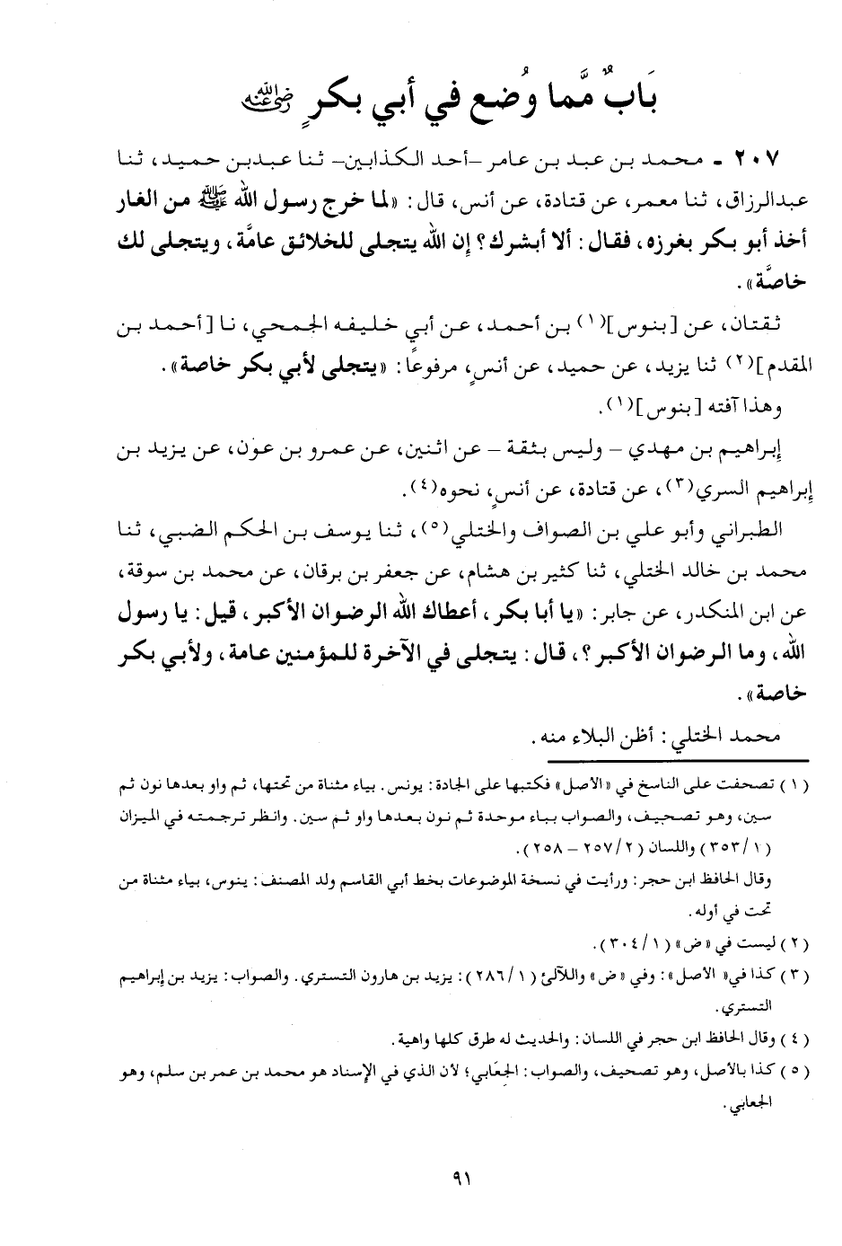 207 -: مُحَمَّد بن عبد بن عَامر - أحد الْكَذَّابين - ثَنَا عبد بن حميد، ثَنَا عبد الرازق، ثَنَا معمر، عَن قَتَادَة، عَن أنس، قَالَ: " لما خرج رَسُول الله صلى الله عَلَيْهِ وَسلم إِلَى الْغَار أَخذ أَبُو بكر بغرزه، فَقَالَ: أَلا أُبَشِّرك؟ إِن الله يتجلى لِلْخَلَائِقِ عَامَّة، ويتجلى لَك خَاصَّة ". ثقتان، عَن [بنوس] بن أَحْمد، عَن أبي خليفه الجُمَحِي، نَا [أَحْمد بن الْمُقدم] ثَنَا يزِيد، عَن حميد، عَن أنس، مَرْفُوعا: " يتجلى لأبي بكر خَاصَّة ". وَهَذَا آفته [بنوس] . إِبْرَاهِيم بن مهْدي - وَلَيْسَ بِثِقَة - عَن اثْنَيْنِ، عَن عَمْرو بن عون، عَن يزِيد بن إِبْرَاهِيم السّري، عَن قَتَادَة، عَن أنس، نَحوه. الطَّبَرَانِيّ وَأَبُو عَليّ بن الصَّواف والختلي، ثَنَا يُوسُف بن الحكم الضَّبِّيّ، ثَنَا مُحَمَّد بن خَالِد الْخُتلِي، ثَنَا كثير بن هِشَام، عَن جَعْفَر بن برْقَان، عَن مُحَمَّد بن سوقة، عَن ابْن الْمُنْكَدر، عَن جَابر: " يَا أَبَا بكر، أَعْطَاك الله الرضْوَان الْأَكْبَر، قيل: يَا رَسُول الله، وَمَا الرضْوَان الْأَكْبَر؟ ، قَالَ: يتجلى فِي الْآخِرَة للْمُؤْمِنين عَامَّة، وَلأبي بكر خَاصَّة ". مُحَمَّد الْخُتلِي: أَظن الْبلَاء مِنْهُ.