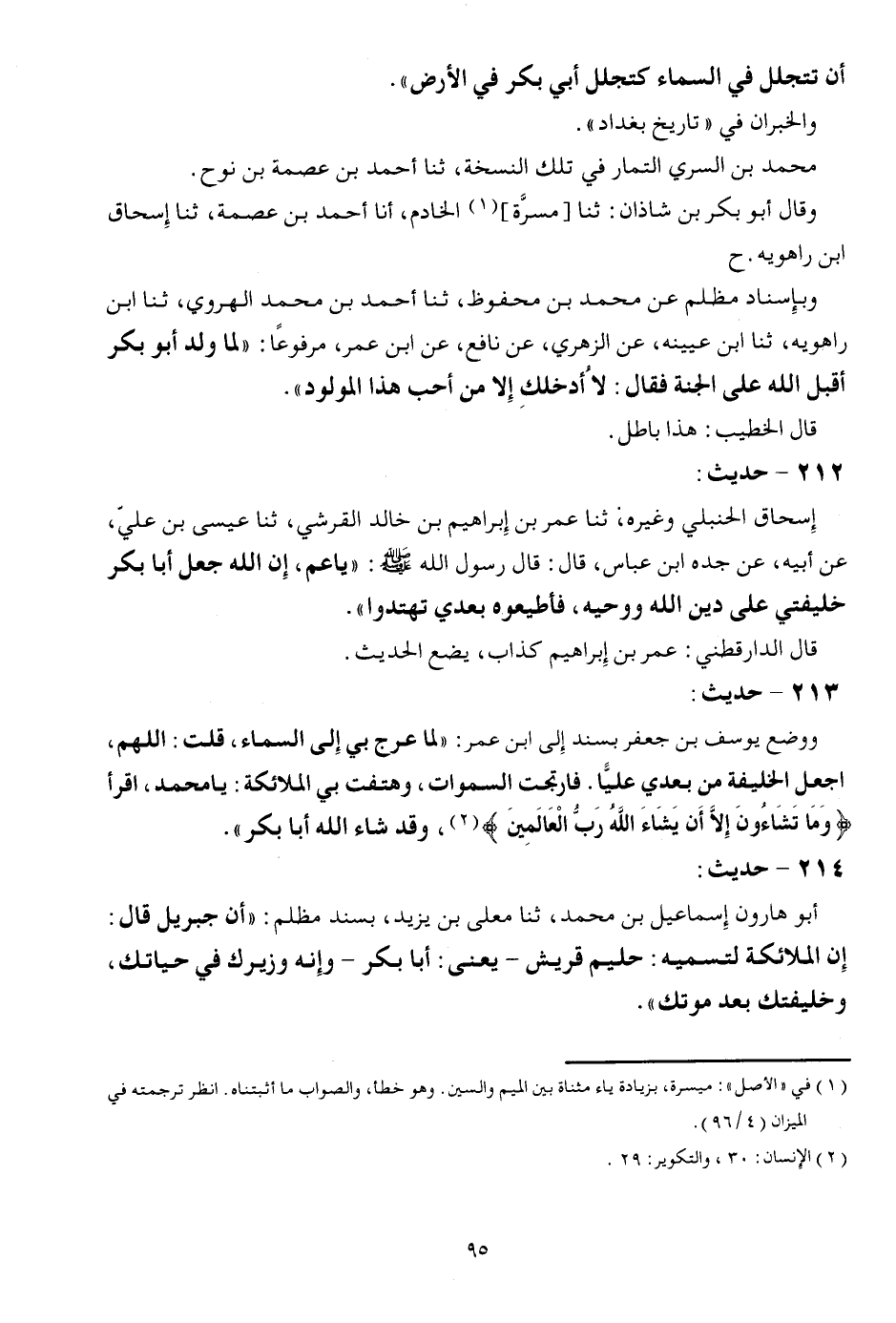 أَن تتجلل فِي السَّمَاء كتجلل أبي بكر فِي الأَرْض ". والخبران فِي " تَارِيخ بَغْدَاد ". مُحَمَّد بن السّري التمار فِي تِلْكَ النُّسْخَة، ثَنَا أَحْمد بن عصمَة بن نوح. وَقَالَ أَبُو بكر بن شَاذان: ثَنَا [مَسَرَّة] الْخَادِم، أَنا أَحْمد بن عصمَة، ثَنَا إِسْحَاق ابْن رَاهَوَيْه. ح وبإسناد مظلم عَن مُحَمَّد بن مَحْفُوظ، ثَنَا أَحْمد بن مُحَمَّد الْهَرَوِيّ، ثَنَا ابْن رَاهَوَيْه، ثَنَا ابْن عيينه، عَن الزُّهْرِيّ، عَن نَافِع، عَن ابْن عمر، مَرْفُوعا: " لما ولد أَبُو بكر أقبل الله على الْجنَّة فَقَالَ: لَا أدْخلك إِلَّا من أحب هَذَا الْمَوْلُود ". قَالَ الْخَطِيب: هَذَا بَاطِل.