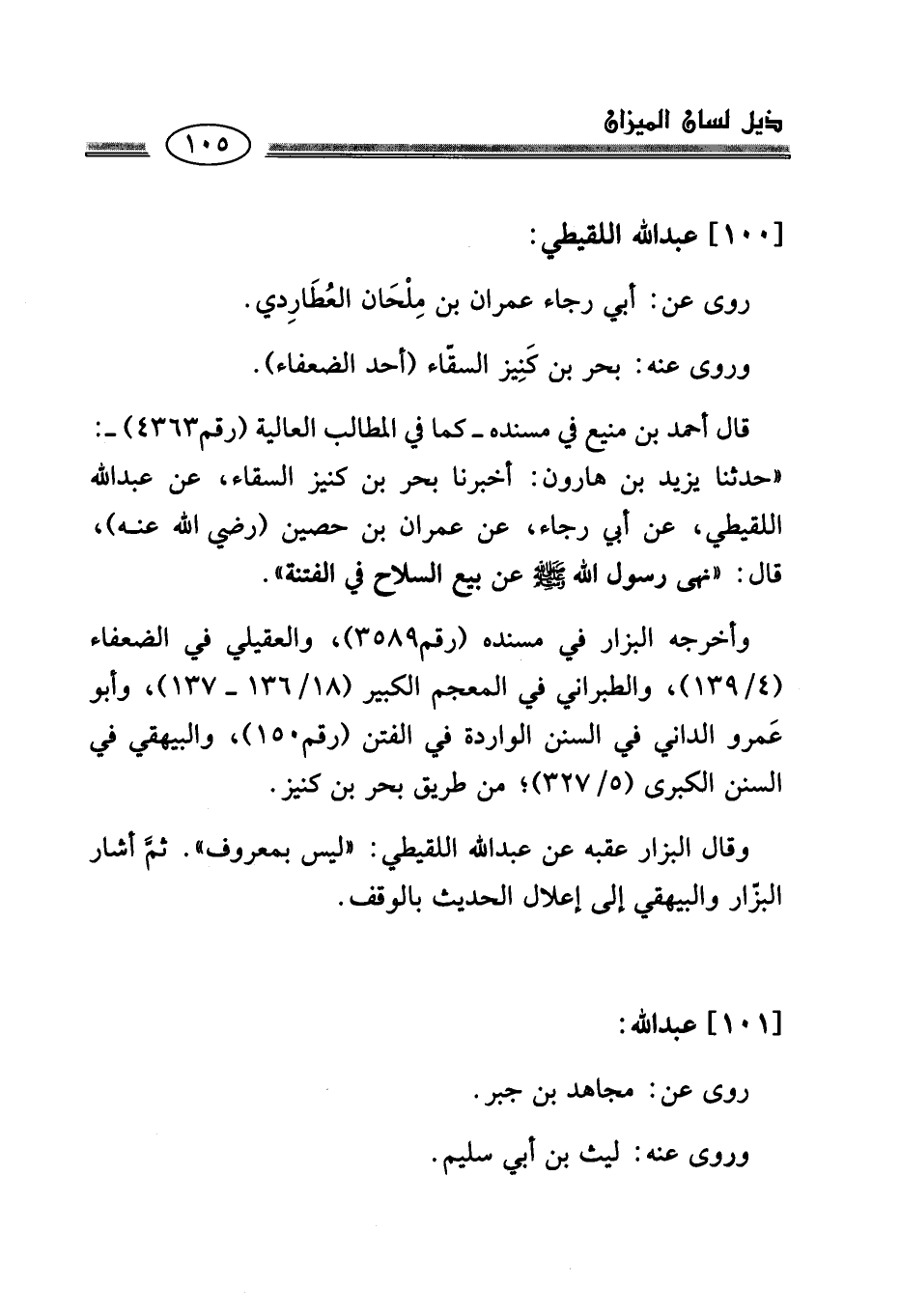 قال أحمد بن منيع في مسنده -كما في المطالب العالية (رقم 4363) -: "حدثنا يزيد بن هارون: أخبرنا بحر بن كنيز السقاء، عن عبد الله اللقيطي، عن أبي رجاء، عن عمران بن حصين (رضي الله عنه)، قال: "نهى رسول الله - صلى الله عليه وسلم - عن بيع السلاح في الفتنة".