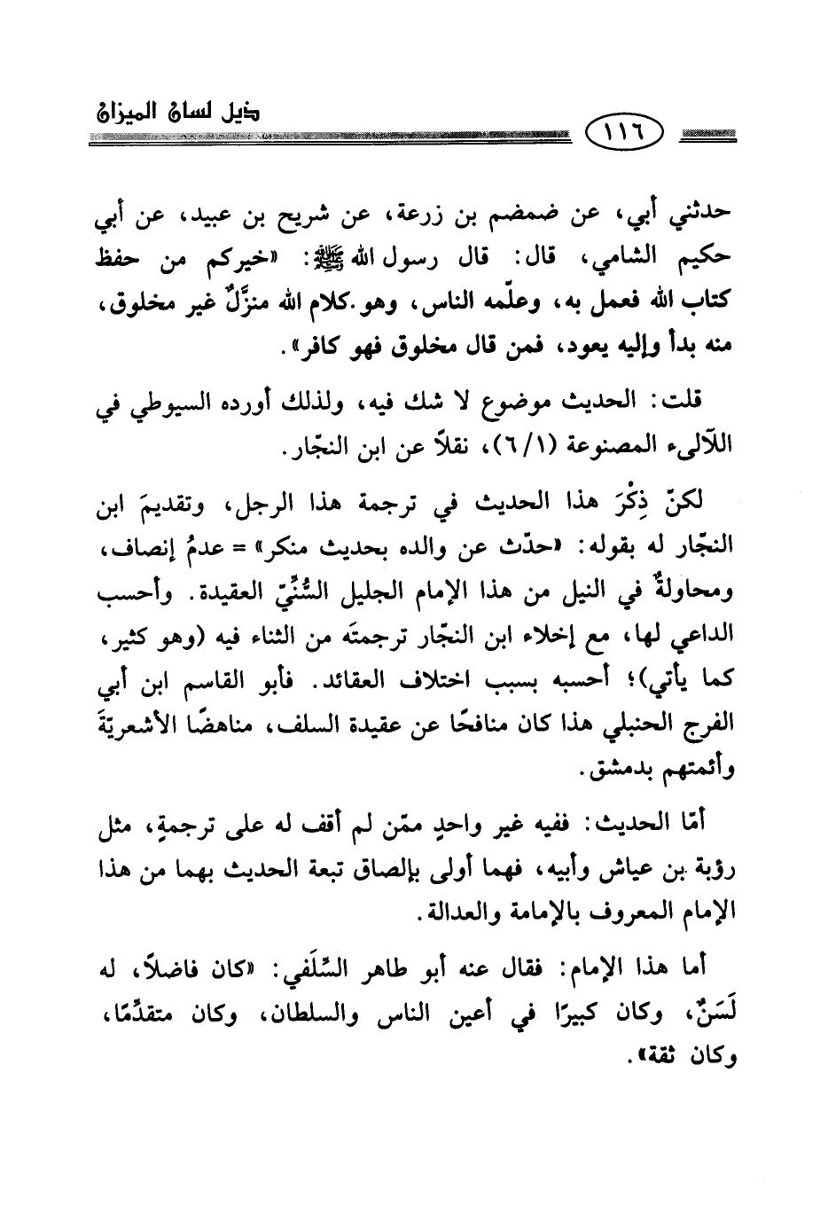 حدثني أبي، عن ضمضم بن زرعة، عن شريح بن عبيد، عن أبي حكيم الشامي، قال: قال رسول الله - صلى الله عليه وسلم -: "خيركم من حفظ كتاب الله فعمل به، وعلّمه الناس، وهو. كلام الله منزَّلٌ غير مخلوق، منه بدأ وإليه بعود، فمن قال مخلوق فهو كافر".