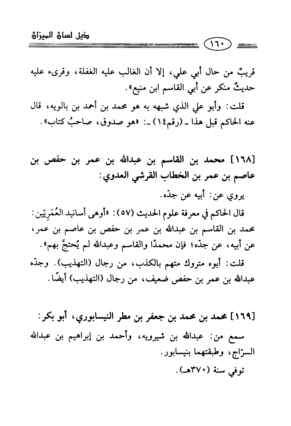 قلت: وأبو علي الذي شبهه به هو محمَّد بن أحمد بن بالويه، قال عنه الحاكم قبل هذا - (رقم 14) -: "هو صدوق، صاحبُ كتاب".