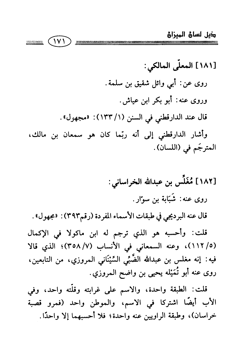 قلت: وأحسبه هو الذي ترجم له ابن ماكولا في الإكمال (5/ 112)، وعنه السمعاني في الأنساب (7/ 358)؛ الذي قالا فيه: إنه مغلس بن عبد الله الضَّبِّي السِّيْنَاني المروزي، من التابعين، روى عنه أبو تُمَيْله يحيى بن واضح المروزي.