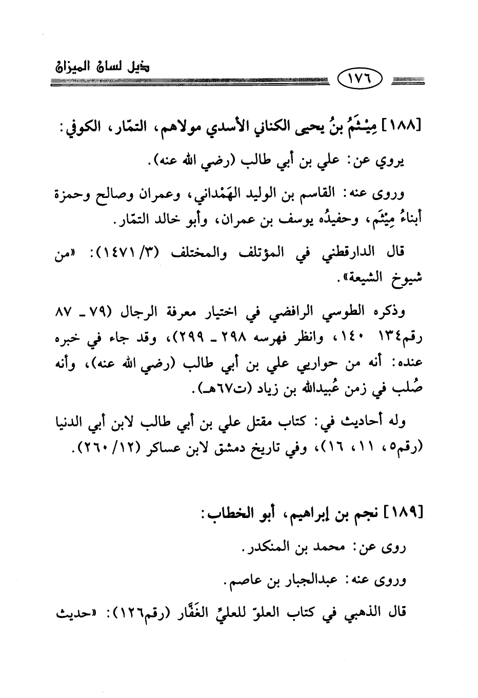 [188] مِيْثَمُ بنُ يحيى الكناني الأسدي مولاهم، التمّار، الكوفي: يروي عن: علي بن أبي طالب (رضي الله عنه):