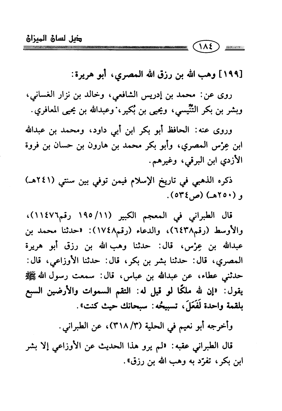 قال الطبراني عقبه: "لم يرو هذا الحديث عن الأوزاعي إلا بشر ابن بكر، تفرّد به وهب الله بن رزق".