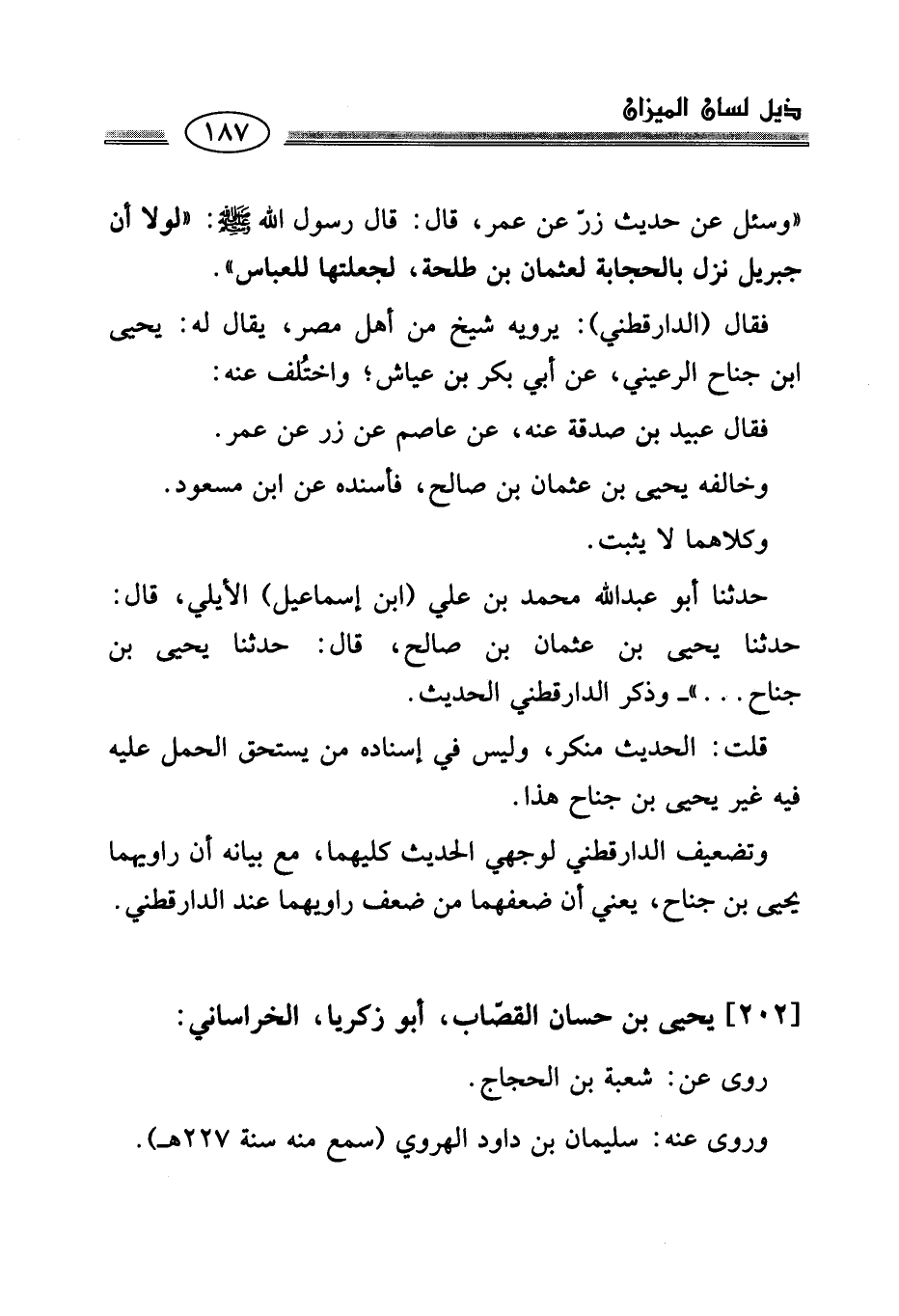 "وسئل عن حديث زرّ عن عمر، قال: قال رسول الله - صلى الله عليه وسلم -: "لولا أن جبريل نزل بالحجابة لعثمان بن طلحة، لجعلتها للعباس".