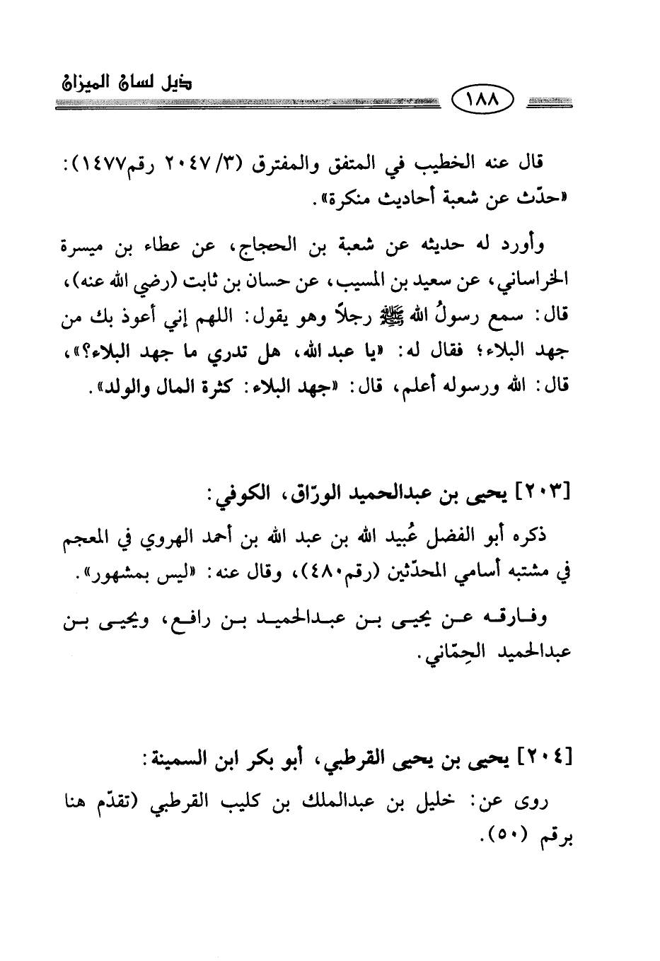وأورد له حديثه عن شعبة بن الحجاج، عن عطاء بن ميسرة الخراساني، عن سعيد بن المسيب، عن حسان بن ثابت (رضي الله عنه)، قال: سمع رسولُ الله - صلى الله عليه وسلم - رجلًا وهو يقول: اللهم إني أعوذ بك من جهد النبلاء؛ فقال له: "يا عبد الله، هل تدري ما جهد البلاء؟ "، قال: الله ورسوله أعلم، قال: "جهد البلاء: كثرة المال والولد".