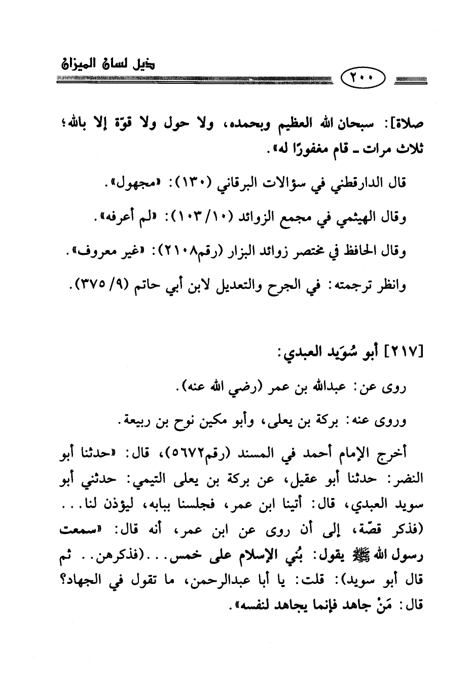 أخرج الإمام أحمد في المسند (رقم 5672)، قال: "حدثنا أبو النضر: حدثنا أبو عقيل، عن بركة بن يعلى التيمي: حدثني أبو سويد العبدي، قال: أتينا ابن عمر، فجلسنا ببابه، ليؤذن لنا ... (فذكر قصّة، إلى أن روى عن ابن عمر، أنه قال: "سمعت رسول الله - صلى الله عليه وسلم - يقول: بُني الإسلام على خمس ... (فذكرهن .. ثم قال أبو سويد): قلت: يا أبا عبد الرحمن، ما تقول في الجهاد؟ قال: مَنْ جاهد فإنما يجاهد لنفسه".