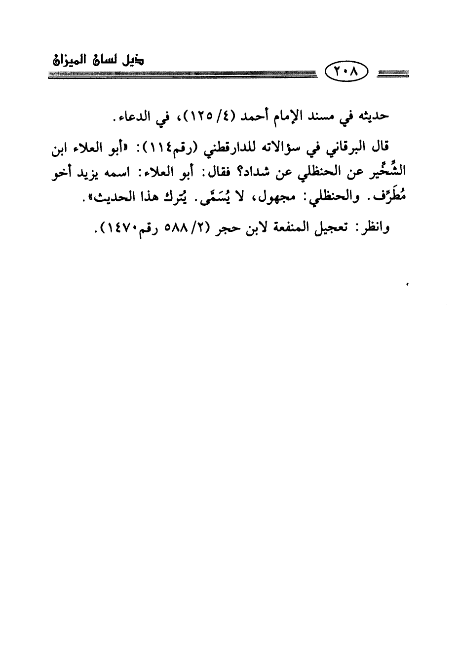 قال البرقاني في سؤالاته للدارقطني (رقم 114): "أبو العلاء ابن الشِّخِّير عن الحنظلي عن شداد؟ فقال: أبو العلاء: اسمه يزيد أخو مُطَرِّف. والحنظلي: مجهول، لا يُسَمَّى. يُترك هذا الحديث".