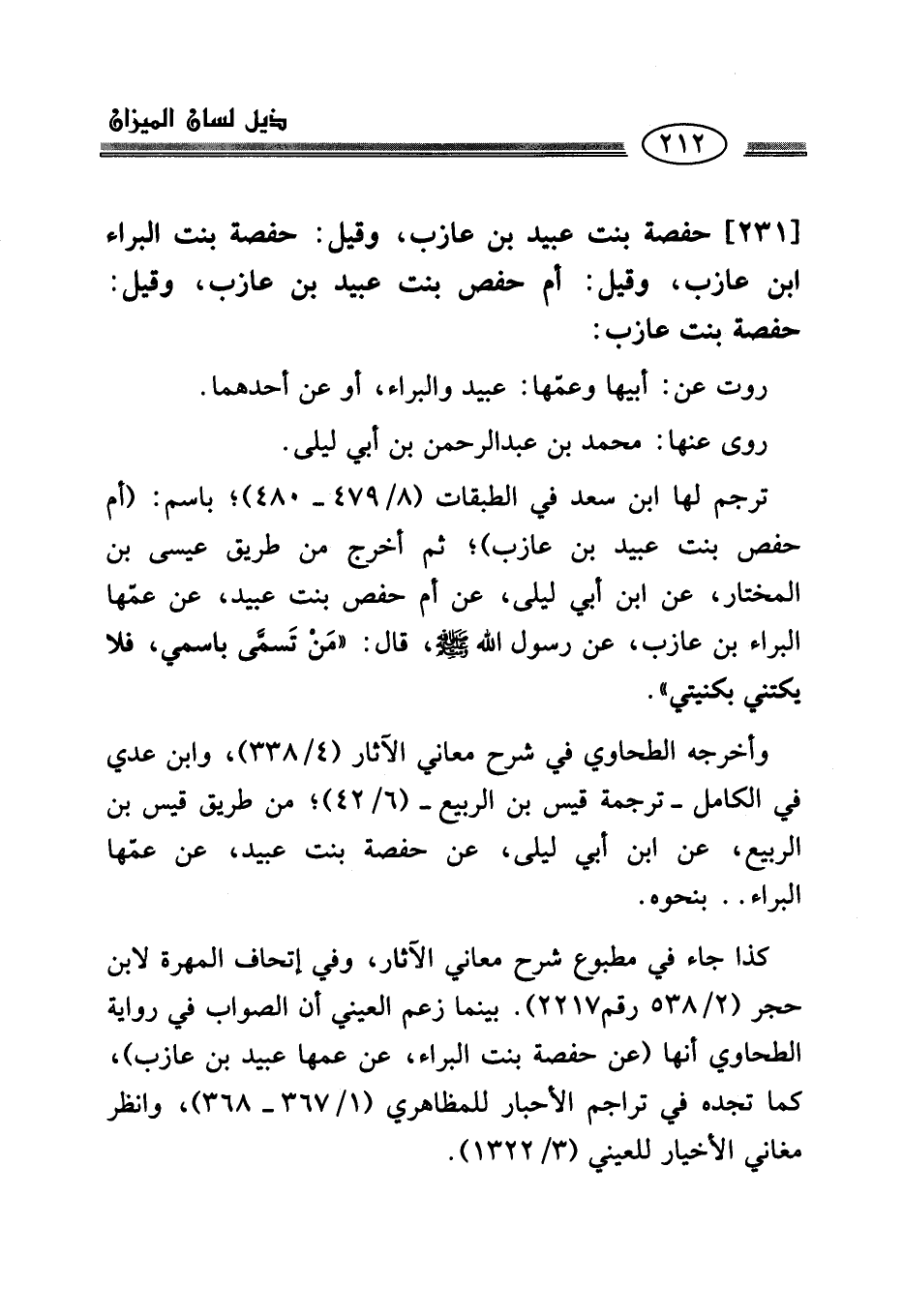 [231] حفصة بنت عبيد بن عازب، وقيل: حفصة بنت البراء ابن عازب، وقيل: أم حفص بنت عبيد بن عازب، وقيل: حفصة بنت عازب: