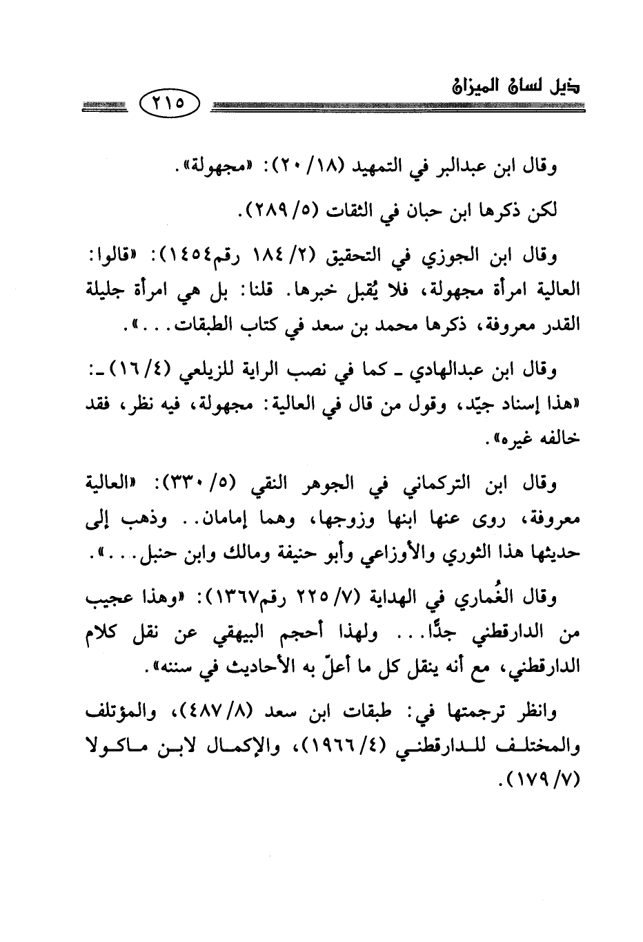 وقال ابن الجوزي في التحقيق (2/ 184 رقم 1454): "قالوا: العالية امرأة مجهولة، فلا يُقبل خبرها. قلنا: بل هي امرأة جليلة القدر معروفة، ذكرها محمَّد بن سعد في كتاب الطبقات ... ".