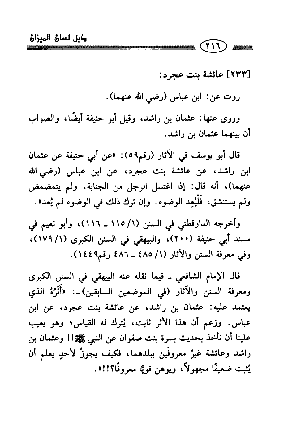 قال الإمام الشافعي -فيما نقله عنه البيهقي في السنن الكبرى ومعرفة السنن والآثار (في الموضعين السابقين) -: "أثَرُهُ الذي يعتمد عليه: عثمان بن راشد، عن عائشة بنت عجرد، عن ابن عباس. وزعم أن هذا الأثر ثابت، يُترك له القياس؛ وهو يعيب علينا أن نأخذ بحديث بسرة بنت صفوان عن النبي - صلى الله عليه وسلم -! وعثمان بن راشد وعائشة غيرُ معروفَين ببلدهما، فكيف يجوزُ لأحدٍ يعلم أن يُثبت ضعيفًا مجهولًا، ويوهن قويًّا معروفًا؟!! ".