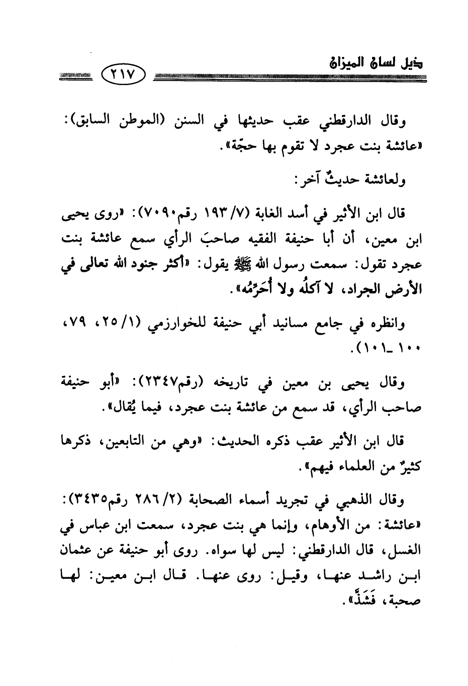 قال ابن الأثير في أسد الغابة (7/ 193 رقم 7090): "روى يحيى ابن معين، أن أبا حنيفة الفقيه صاحبَ الرأي سمع عائشة بنت عجرد تقول: سمعت رسول الله - صلى الله عليه وسلم -. يقول: "أكثر جنود الله تعالى في الأرض الجراد، لا آكلُه ولا أُحَرِّمُه".
