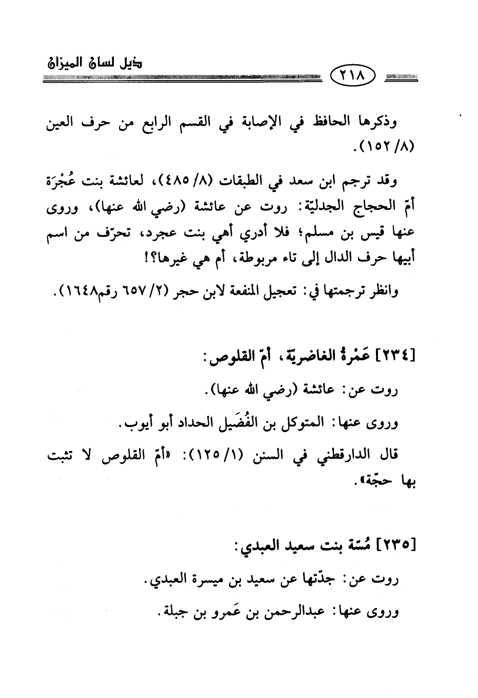وقد ترجم ابن سعد في الطبقات (8/ 485)، لعائشة بنت عُجْرَة أمَّ الحجاج الجدليّة: روت عن عائشة (رضي الله عنها)، وروى عنها قيس بن مسلم؛ فلا أدري أهي بنت عجرد، تحرّف من اسم أبيها حرف الدال إلى تاء مربوطة، أم هي غيرها؟!