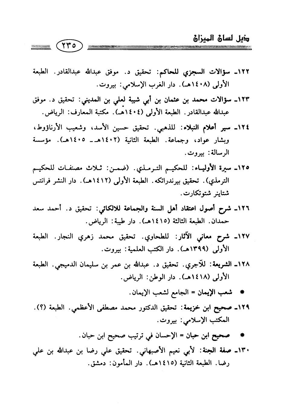 122 - سؤالات السجزي للحاكم: تحقيق د. موفق عبد الله عبد القادر. الطبعة الأولى (1408 هـ). دار الغرب الإِسلامي: بيروت.