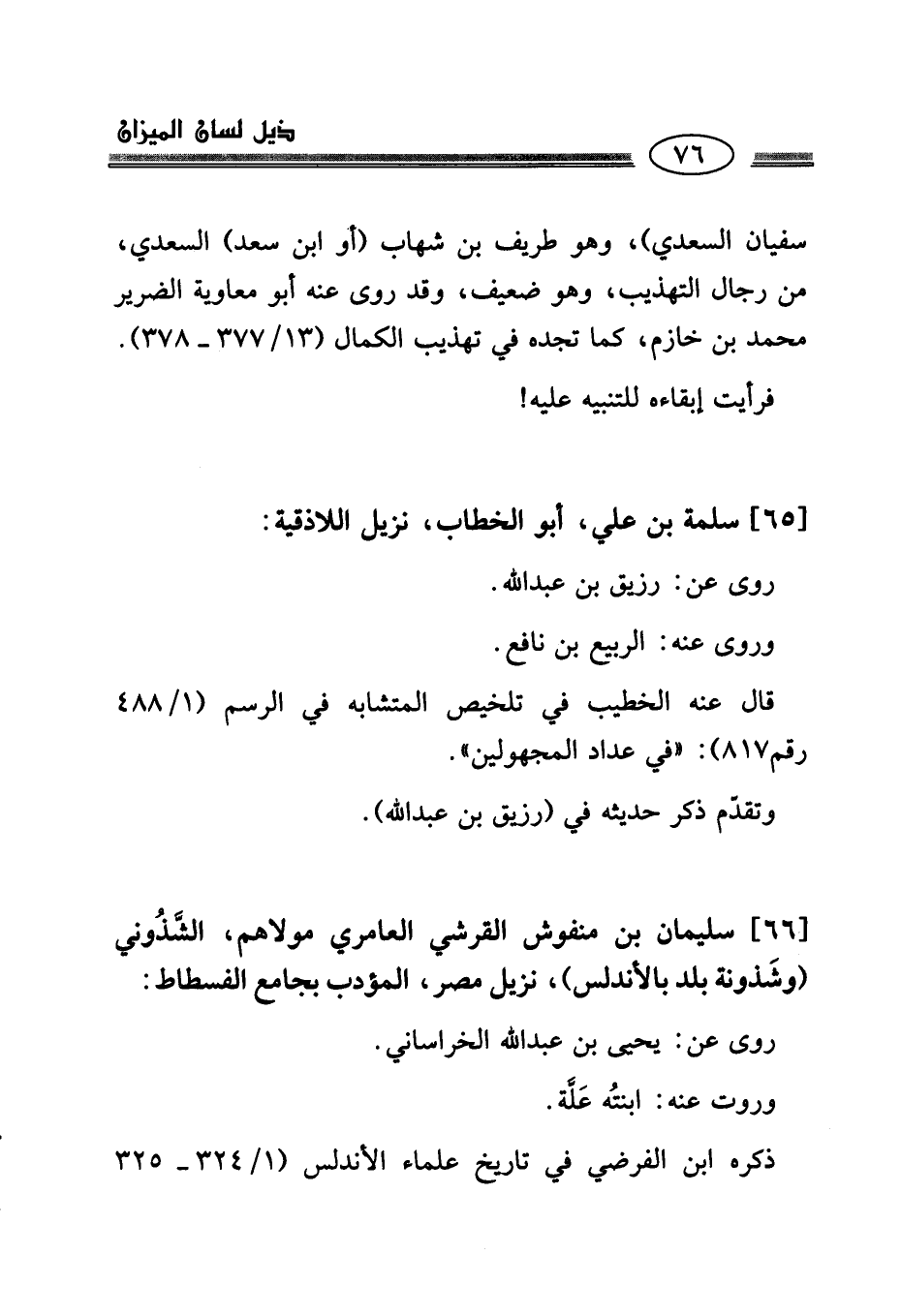 سفيان السعدي)، وهو طريف بن شهاب (أو ابن سعد) السعدي، من رجال التهذيب، وهو ضعيف، وقد روى عنه أبو معاوية الضرير محمَّد بن خازم، كما تجده في تهذيب الكمال (13/ 377 - 378).