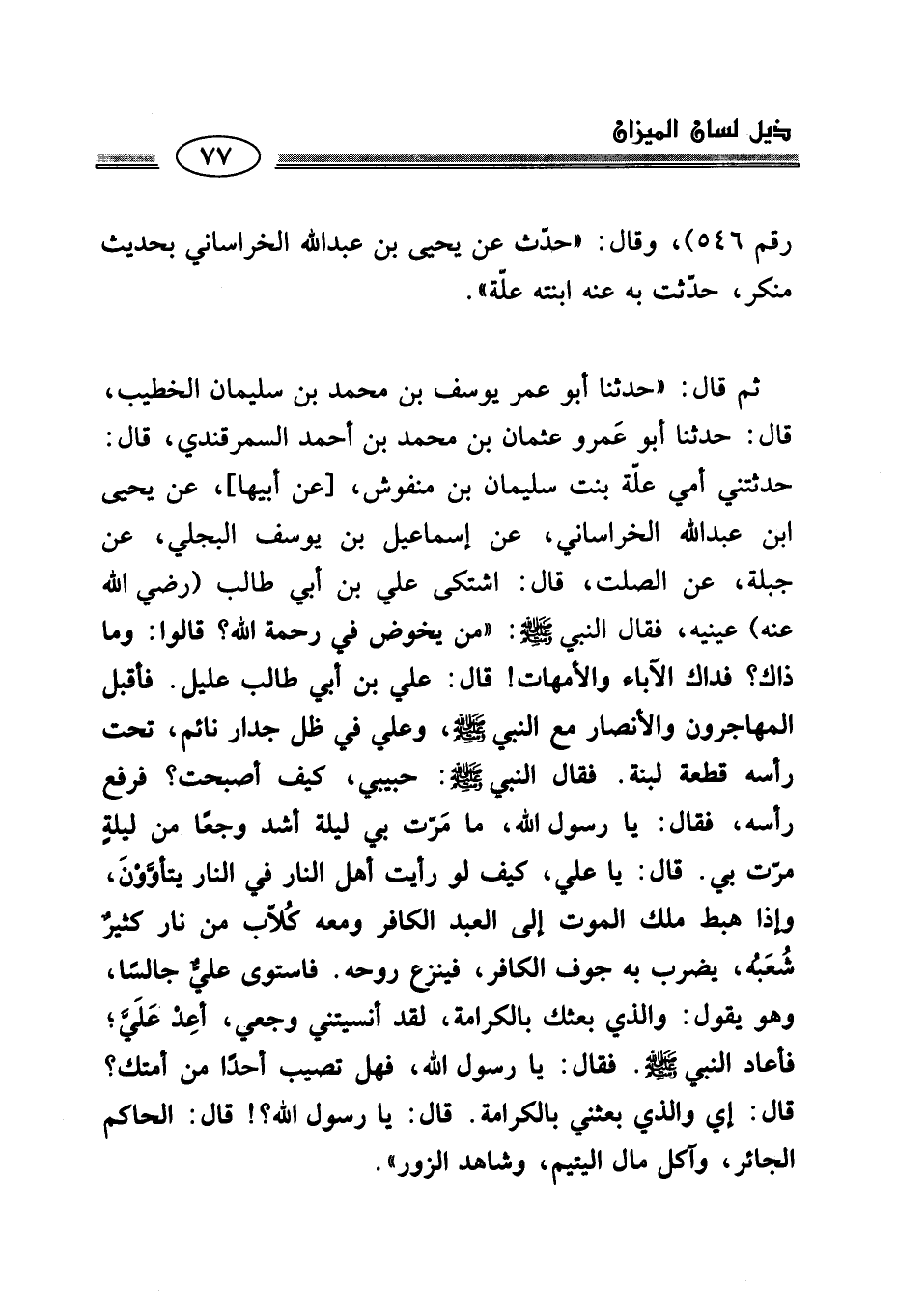 ثم قال: "حدثنا أبو عمر يوسف بن محمَّد بن سليمان الخطيب، قال: حدثنا أبو عَمرو عثمان بن محمَّد بن أحمد السمرقندي، قال: حدثتني أمي علّة بنت سليمان بن منفوش، [عن أبيها]، عن يحيى ابن عبد الله الخراساني، عن إسماعيل بن يوسف البجلي، عن جبلة، عن الصلت، قال: اشتكى علي بن أبي طالب (رضي الله عنه) عينيه، فقال النبي - صلى الله عليه وسلم -: "من يخوض في رحمة الله؟ قالوا: وما ذاك؟ فداك الآباء والأمهات! قال: علي بن أبي طالب علبل. فأقبل المهاجرون والأنصار مع النبي - صلى الله عليه وسلم -، وعلي في ظل جدار نائم، تحت رأسه قطعة لبنة. فقال النبي - صلى الله عليه وسلم -: حبيبي، كيف أصبحت؟ فرفع رأسه، فقال: يا رسول الله، ما مَرّت بي ليلة أشد وجعًا من ليلةٍ مرّت بي. قال: يا علي، كيف لو رأيت أهل النار في النار يتأوَّوْنَ، وإذا هبط ملك الموت إلى العبد الكافر ومعه كُلّاب من نار كثيرٌ شُعَبُه، يضرب به جوف الكافر، فينزع روحه. فاستوى عليٌّ جالسًا، وهو يقول: والذي بعثك بالكرامة، لقد أنسيتني وجعي، أعِدْ علَيَّ؛ فأعاد النبي - صلى الله عليه وسلم -. فقال: يا رسول الله، فهل تصيب أحدًا من أمتك؟ قال: إي والذي بعثني بالكرامة. قال: يا رسول الله؟! قال: الحاكم الجائر، وآكل مال اليتيم، وشاهد الزور".