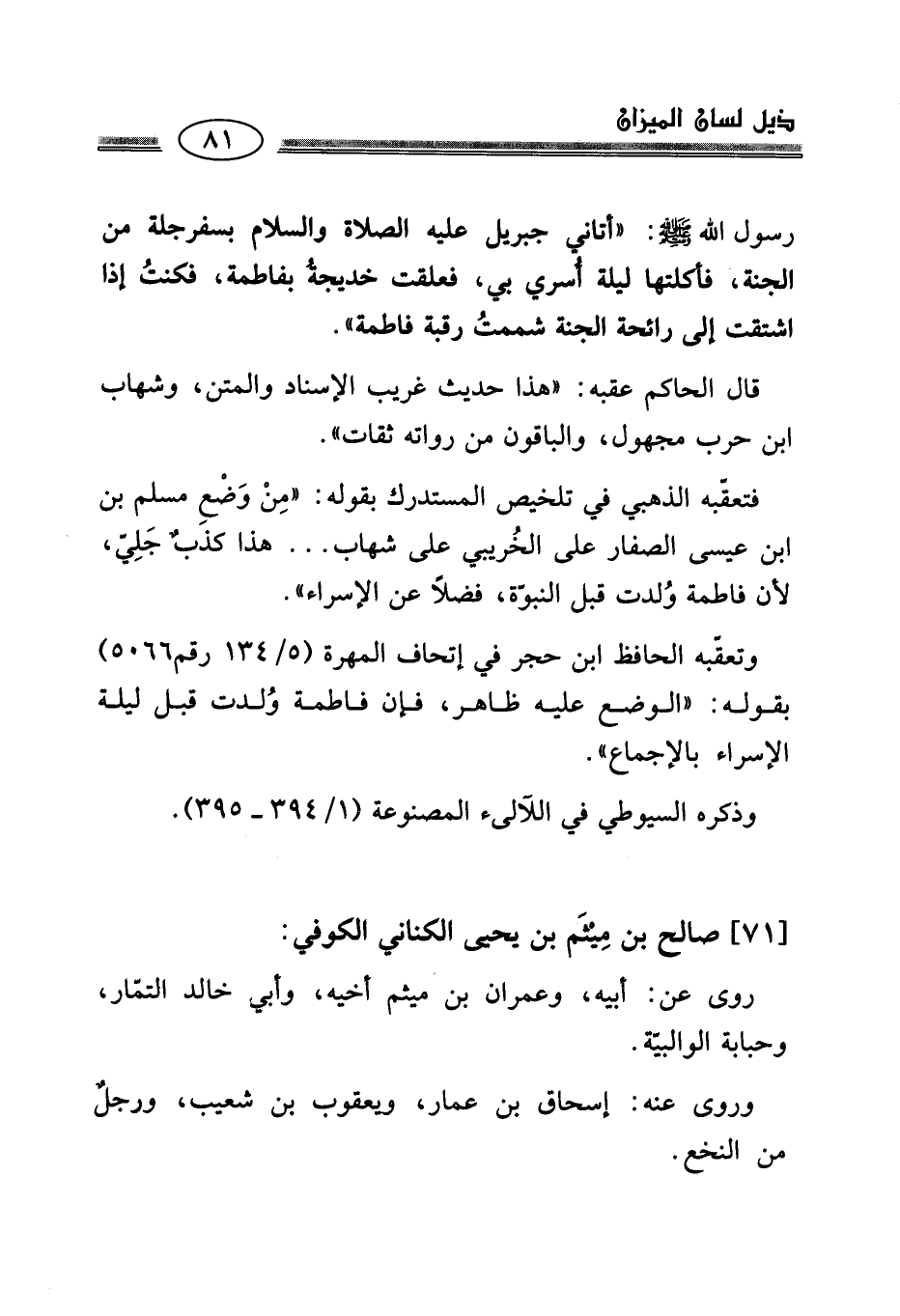 وتعقبه الحافظ ابن حجر في إتحاف المهرة (5/ 134 رقم 5066) بقوله: "الوضع عليه ظاهر، فإن فاطمة وُلدت قبل ليلة الإسراء بالإجماع".