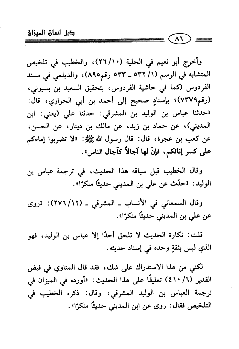 لكني من هذا الاستدراك على شك، فقد قال المناوي في فيض القدير (6/ 410) تعليقًا على هذا الحديث: "أورده في الميزان في ترجمة العباس بن الوليد المشرقي، وقال: ذكره الخطيب في التلخيص فقال: روى عن ابن المديني حديثًا منكرًا".