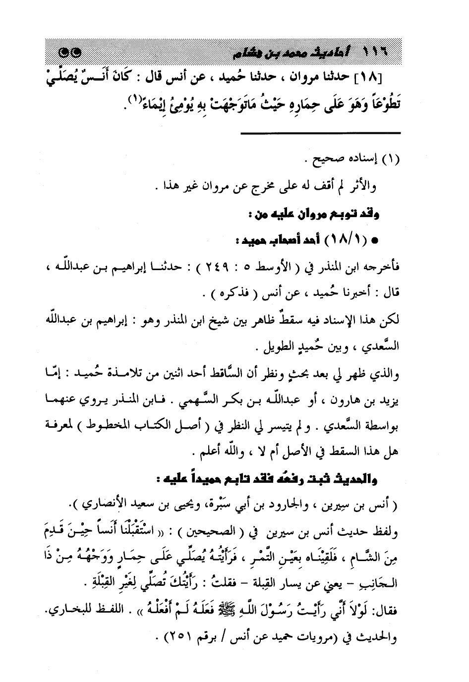18 - حَدَّثَنَا مَرْوَانُ، حَدَّثَنَا حُمَيْدٌ، عَنْ أَنَسٍ، قَالَ: «كَانَ أَنَسٌ §يُصَلِّي تَطَوُّعًا، وَهُوَ عَلَى حِمَارِهِ حَيْثُ مَا تَوَجَّهَتْ بِهِ يُومِئُ إِيمَاءً»