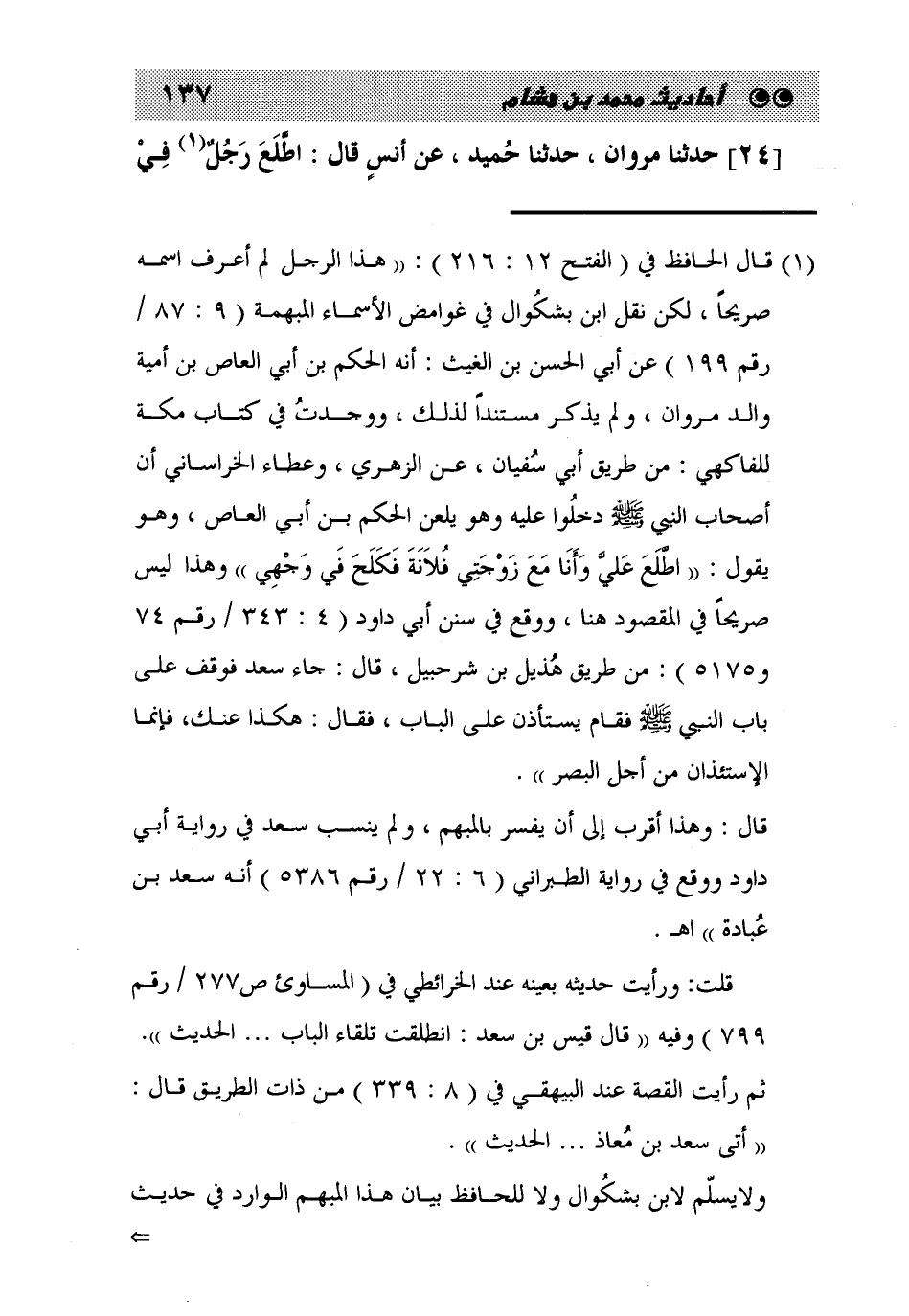 24 - حَدَّثَنَا مَرْوَانُ، حَدَّثَنَا حُمَيْدٌ، عَنْ أَنَسٍ، قَالَ: اطَّلَعَ رَجُلٌ فِي -[138]- حُجْرَةِ النَّبِيِّ صَلَّى اللهُ عَلَيْهِ وَسَلَّمَ، «§فَأَشَارَ رَسُولُ اللَّهِ صَلَّى اللهُ عَلَيْهِ وَسَلَّمَ بِمِشْقَصٍ لَهُ» ، فَأَخْرَجَ الرَّجُلُ رَأْسَهُ