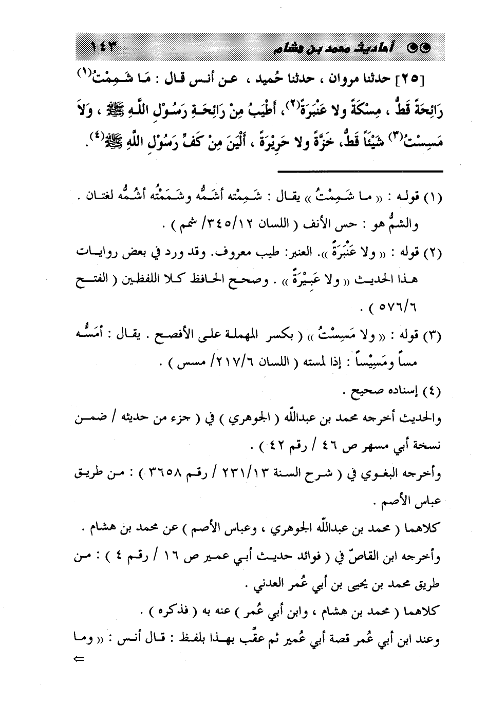 25 - حَدَّثَنَا مَرْوَانُ، حَدَّثَنَا حُمَيْدٌ، عَنْ أَنَسٍ، قَالَ: «§مَا شَمِمْتُ رَائِحَةً قَطُّ، مِسْكَةً، وَلَا عَنْبَرَةً، أَطْيَبَ مِنْ رَائِحَةِ رَسُولِ اللَّهِ صَلَّى اللهُ عَلَيْهِ وَسَلَّمَ، وَلَا مَسِسْتُ شَيْئًا قَطُّ، خَزَّةً، وَلَا حَرِيرَةً، أَلْيَنَ مِنْ كَفِّ رَسُولِ اللَّهِ صَلَّى اللهُ عَلَيْهِ وَسَلَّمَ»