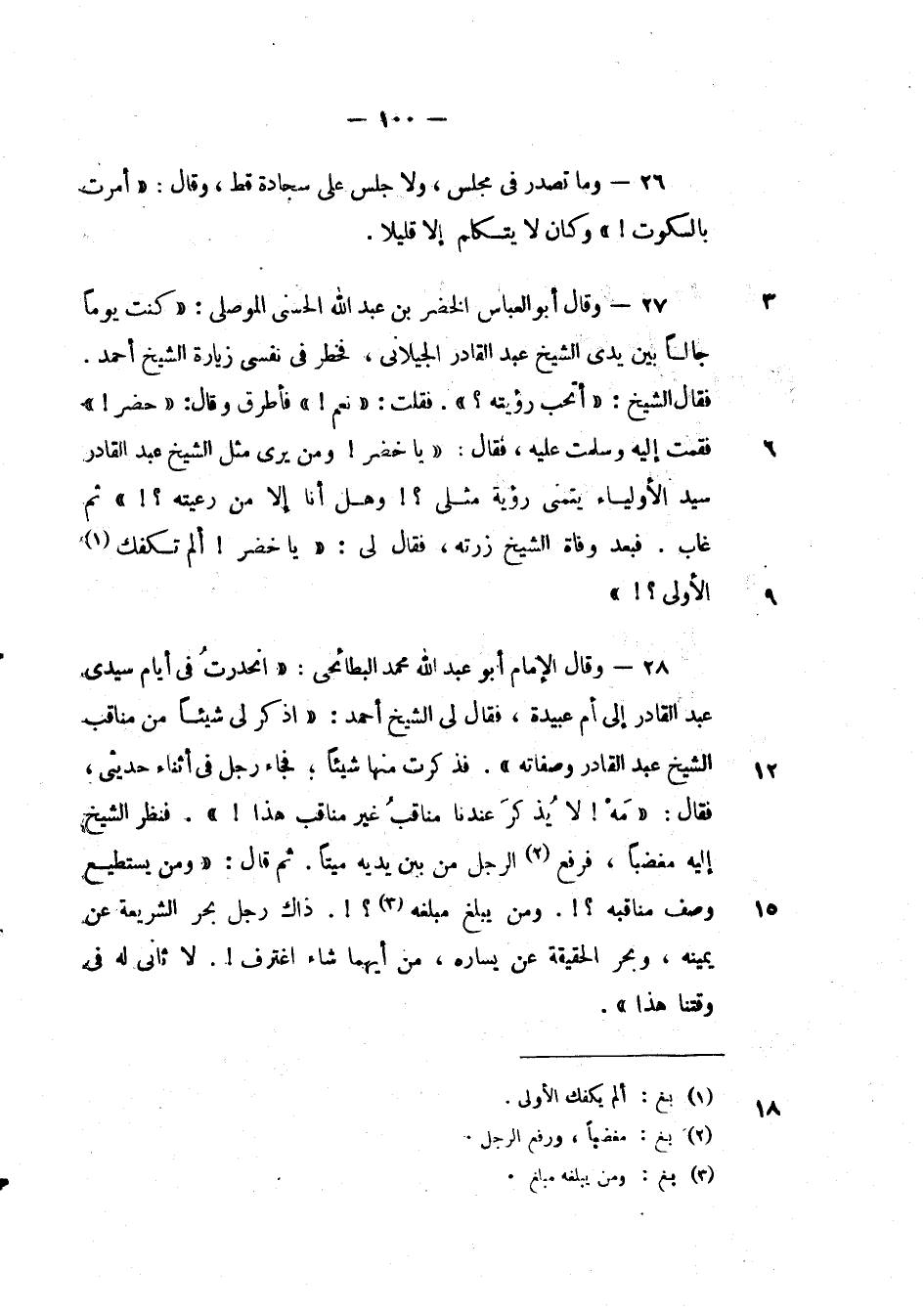 وقال الإمام أبو عبد الله محمد البطائحي: " انحدرت في أيامي سيدي عبد القادر إلى أم عبيدة، فقال لى الشيخ أحمد: " اذكر لى شيئاً من مناقب الشيخ عبد القادر وصفاته ". فذكرت منها شيئاً؛ فجاء رجل في أثناء حديثي، فقال: " مه! لايذكر عندنا مناقب هذا! ". فنظر الشيخ أليه مغضباً، فرفع الرجل من بين يديه ميتاً. ثم قال: " ومن يستطيع وصف مناقبه؟!. ومن يبلغ مبلغه؟!. ذاك رجل بحر الشريعة على يمينه، وبحر الحقيقة عن يساره، من أيهما شاء اغترف!. لا ثاني له في وقتنا هذا ".