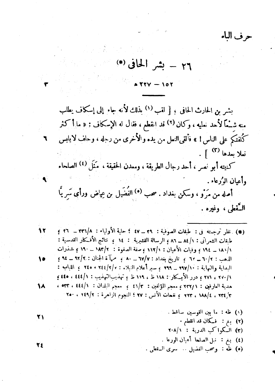 بشر الحارث الحافى؛ لقب بذلك لأنه جاء إلى إسكاف يطلب منه شسعاً لأحد نعليه، وكان قد انقطع، فقال له الإسكاف: " وما أكثر كلفتكم على الناس! " فألقى النعل من يده والأخرى من رجله، وحلف لا يلبس نعلا بعدها.