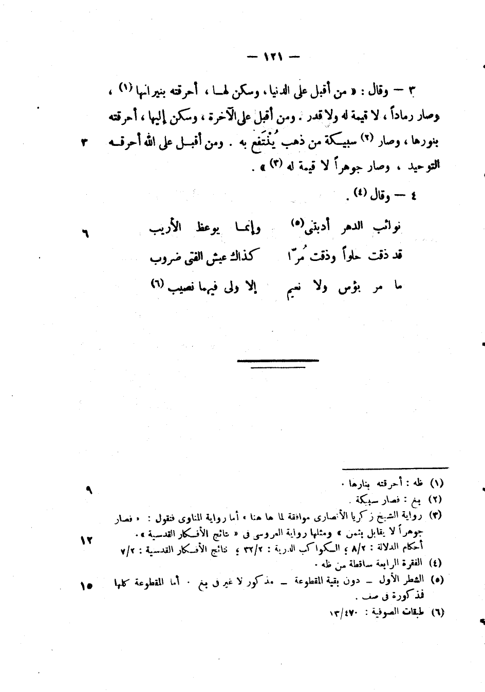 وقال: " من اقبل على الدنيا، وسكن لها، أحرقته بنيرانها، وصار رماداص، لا قيمة له ولا قدر. ومن أقبل على الآخرة، وسكن اليها، أحرقته بنورها، وصار سبيكة من ذهب ينتفع به. ومن أقبل على الله أحرقه التوحيد، فصار جوهراً لا قيمة له ".