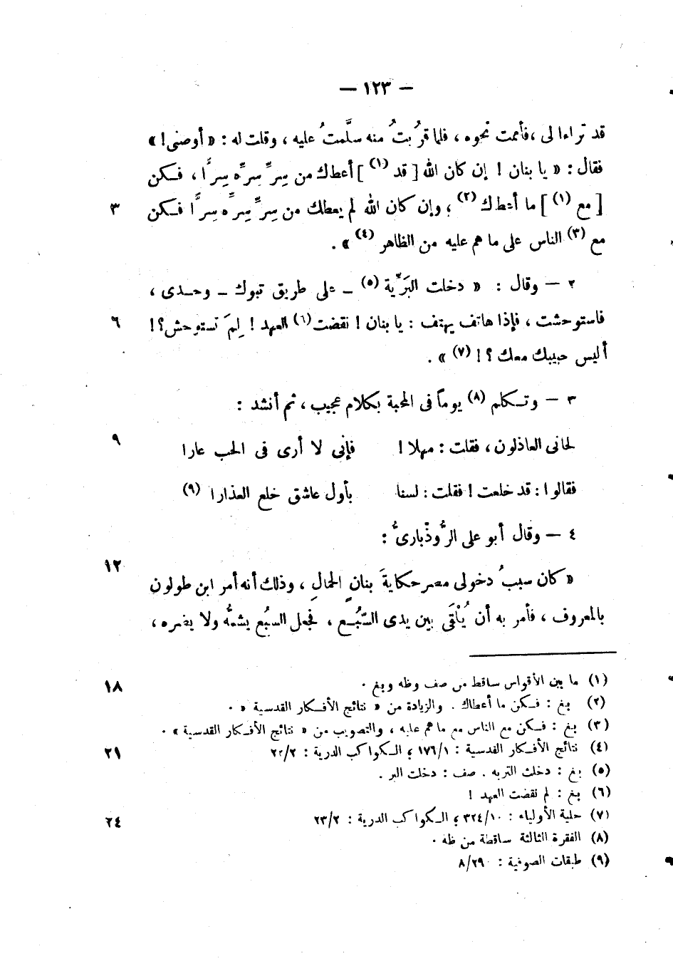 وقال: " دخلت البرية - على طريق تبوك - وحدي، فاستوحشت، فإذا هاتف يهتف: يا بنان! نقضت العهد! لم تستوحش؟! أليس حبيبك معك؟! ".