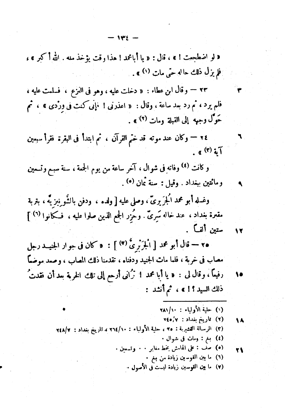 وقال ابن عطاء: " دخلت عليه، وهو في النزع، فسلمت عليه، فلم يرد، ثم رد بعد ساعة، وقال: " اعذرني! فإني كنت في وردي "، ثم حول وجهه إلي القبلة ومات ".