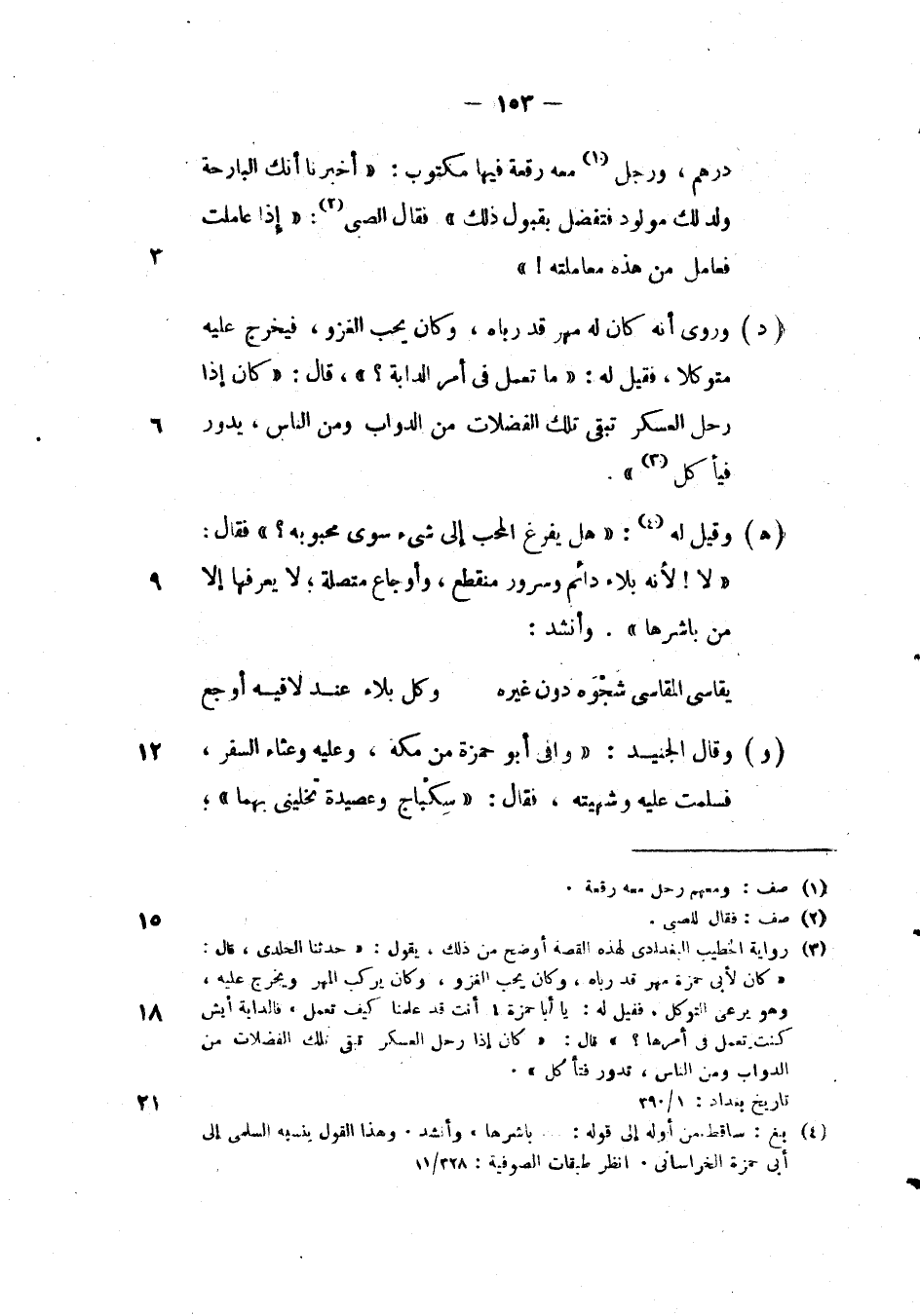 وقال الجنيد: " وافي أبو حمزة من مكة، وعليه وعناء السفر، فسلمت عليه وشهيته، فقال: " سكباج وعصيدة تخليني بهما "؛