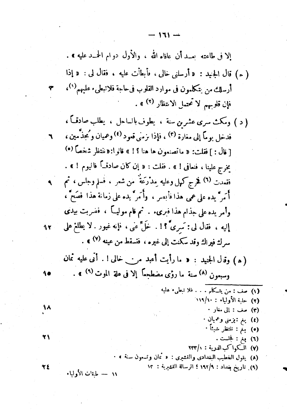 قال الجنيد: " أرسلني خاليي، فأبطأت عليه، فقال لي: " إذا أرسلك من يتكلمون في موارد القلوب في حاجة فلا تبطئ عليهم، فإن قلوبهم لا يتحمل الانتظار ".