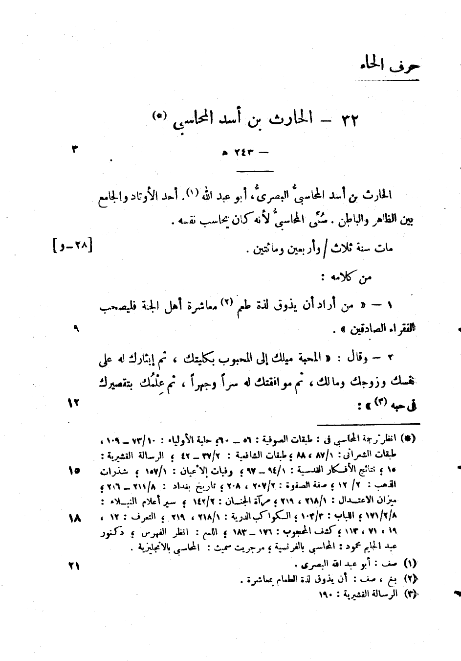 الحارث بن أسد المحاسبي البصري أبو عبد الله. أحد الآوتاد والجامع بين الظاهر والباطن. سمي المحاسبي لأنه كان يحاسب نفسه.