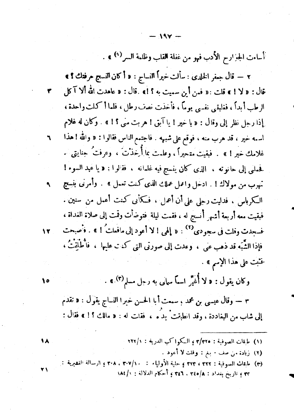 قال جعفر الخلدي: سألت خيراً النساج: " أكان النسج حرفتك؟ " قال: " لا! " قلت: " فمن اين سميت به؟! " قال: " عاهدت الله ألا آكل الرطب أبداً، فغلبتني نفسي يوماً، فأخذت نصف رطل، فلما أكلت واحدة، إذا رجل نظر إلى وقال: " يا خير! يا آبق! هربت منى؟! ". وكان له غلام اسمه خير، قد هرب منه، فوقع على شبهه. فاجتمع الناس فقالوا: " والله! هذا غلامك خير! ". فبقيت متحيراً، وعلمت بما أخذت، وعرفت جنايتي. فحملني إلى حانوته، الذي كان ينسج فيه غلمانه، فقالوا: " يا عبد السوء! تهرب من مولاك!. ادخل واعمل عملك الذي كنت تعمل ". وأمرني بنسج الكرباس. فدليت رجلي على أن أعمل، فكأني كنت أعمل من سنين. فبقيت معه أربعة أشهر أنسج له، فقمت ليلة فتوضأت وقمت إلى صلاة الغداة، فسجدت وقلت في سجودي: " إلهي! لا أعود إلى ما فعلت! ". فأصبحت فإذا الشبه قد ذهب عنى، وعدت إلى صورتي التي كنت عليها، فأطلقت، فثبت على هذا الاسم ".
