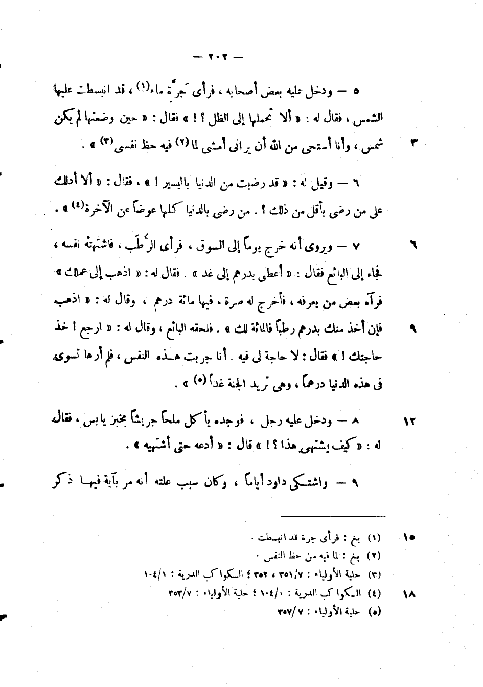 ودخل عليه بعض أصحابه، فرأى جرة ماء، قد انبسطت عليها الشمس، فقال له: " ألا تحملها إلى الظل؟ " فقال: " حين وضعتها لم يكن شمس، وأنا أستحي من الله أن يراني أمشى لما فيه حظ نفسي ".