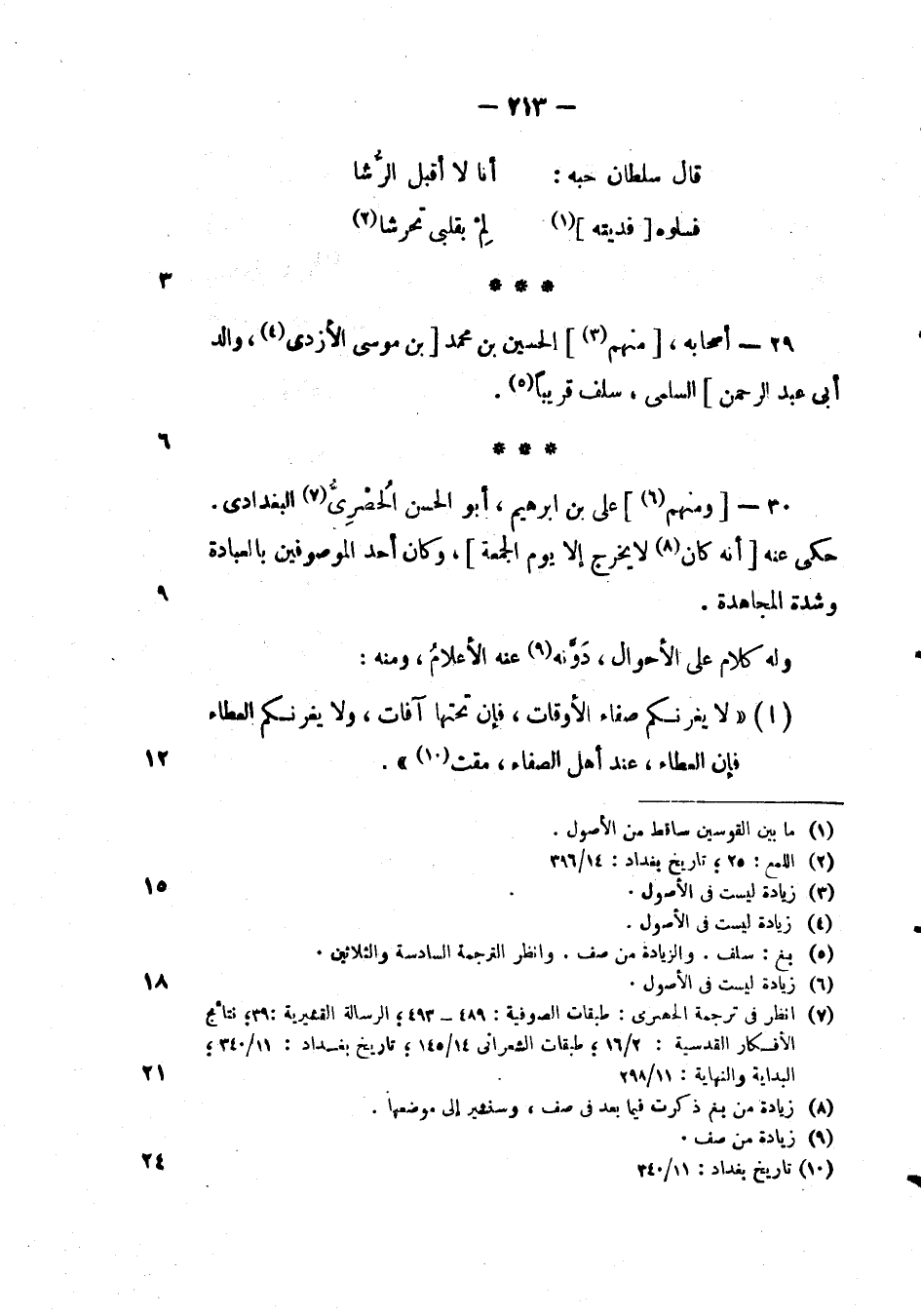 ومنهم على بن إبرهيم، أبو الحسن الحصري البغدادي. حكى عنه انه كان لا يخرج إلا يوم الجمعة، وكان أحد الموصوفين بالعباده وشدة المجاهدة. وله كلام على الأحوال، دونه عنه الأعلام، ومنه: " لا يغرنكم صفاء الأوقات، فان تحتها آفات، ولا يغرنكم العطاء فان العطاء، عند أهل الصفاء، مقت ".