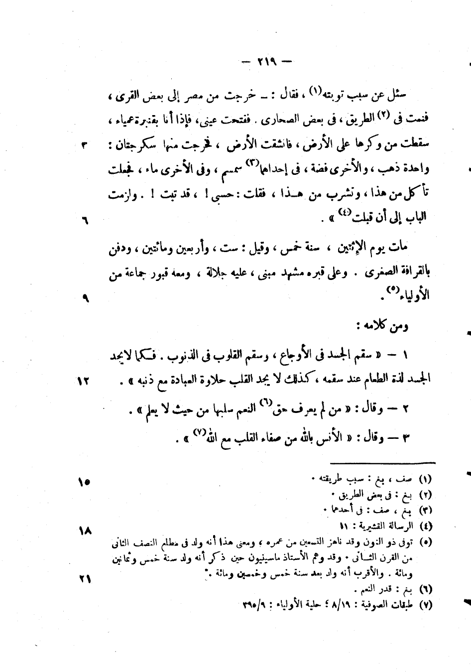 ومن كلامه: سقم الجسد في الاوجاع، وسقم القلوب في الذنوب. فكما لا يجد الجسد لذة في الطعام عند سقمه، كذلك لا يجد القلب حلاوة العبادة مع ذنبه ".
