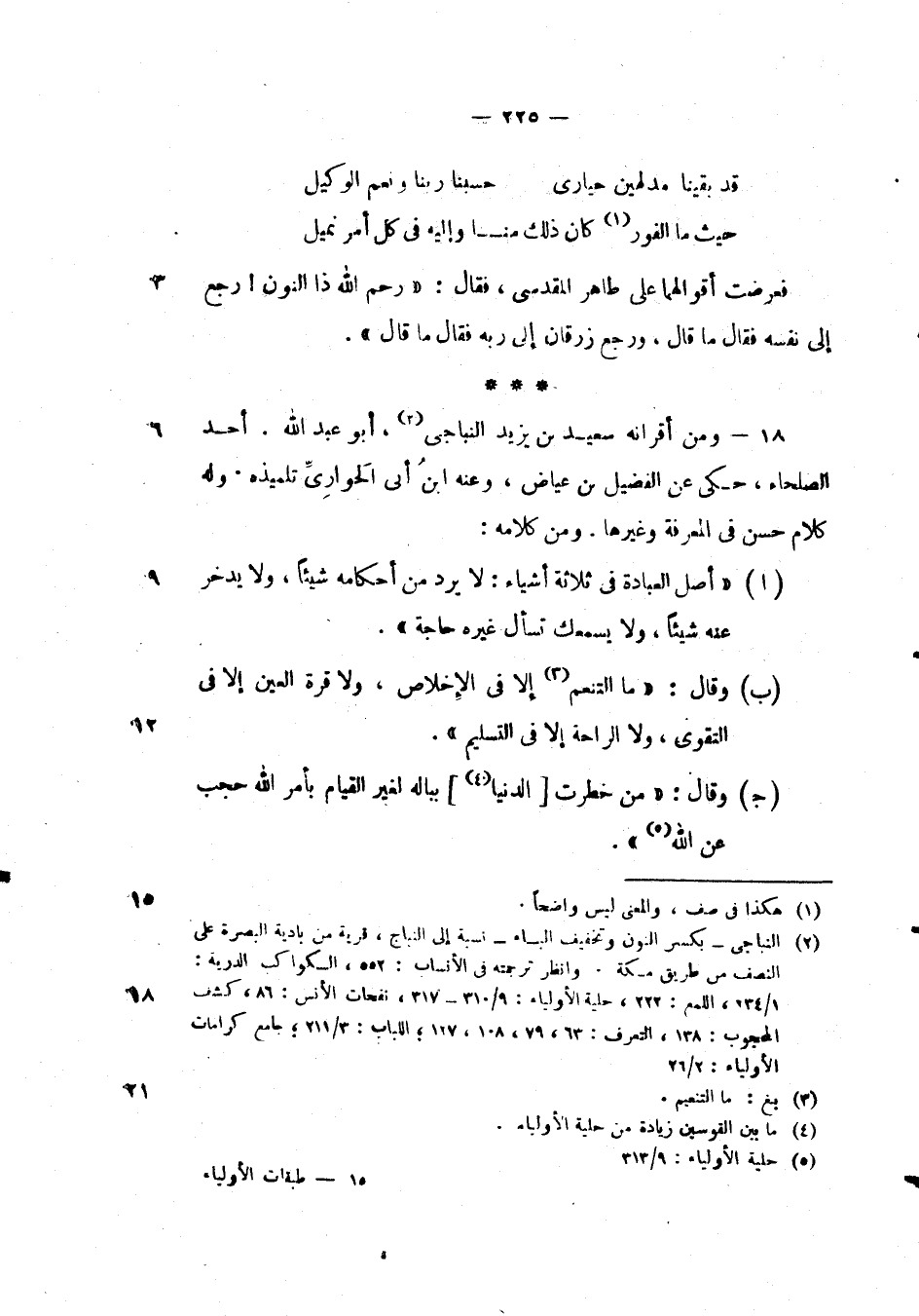 ومن اقرانه سعيد بن يزيد النباجي، ابو عبد الله. احد الصلاحاء، حكى عن الفضيل بن عياض، وعنه ابن ابي الحواري تلميذه. وله كلام حسن في المعرفة وغيرها. ومن كلامه: " اصل العبادة في ثلاثة اشياء: لا يرد من احكامه شيئاً، ولا يدخر عنه شيئاً، ولا يمسك تسأل غيره حاجة ".