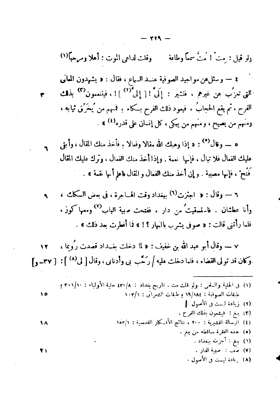 وسئل عن مواجيد الصوفية عند السماع، فقال: " يشهدون المعاني التي تعزُب عن غيرهم، فتشير: إلى! إلى!، فيتنعمون بذلك الفرح، ثم يقع الحجابُ، فيعود ذلك الفرح بكاء؛ فمنهم من يُخَرق ثيابه، ومنهم من يصيح، ومنهم من يبكي، كل إنسان على قدره ".