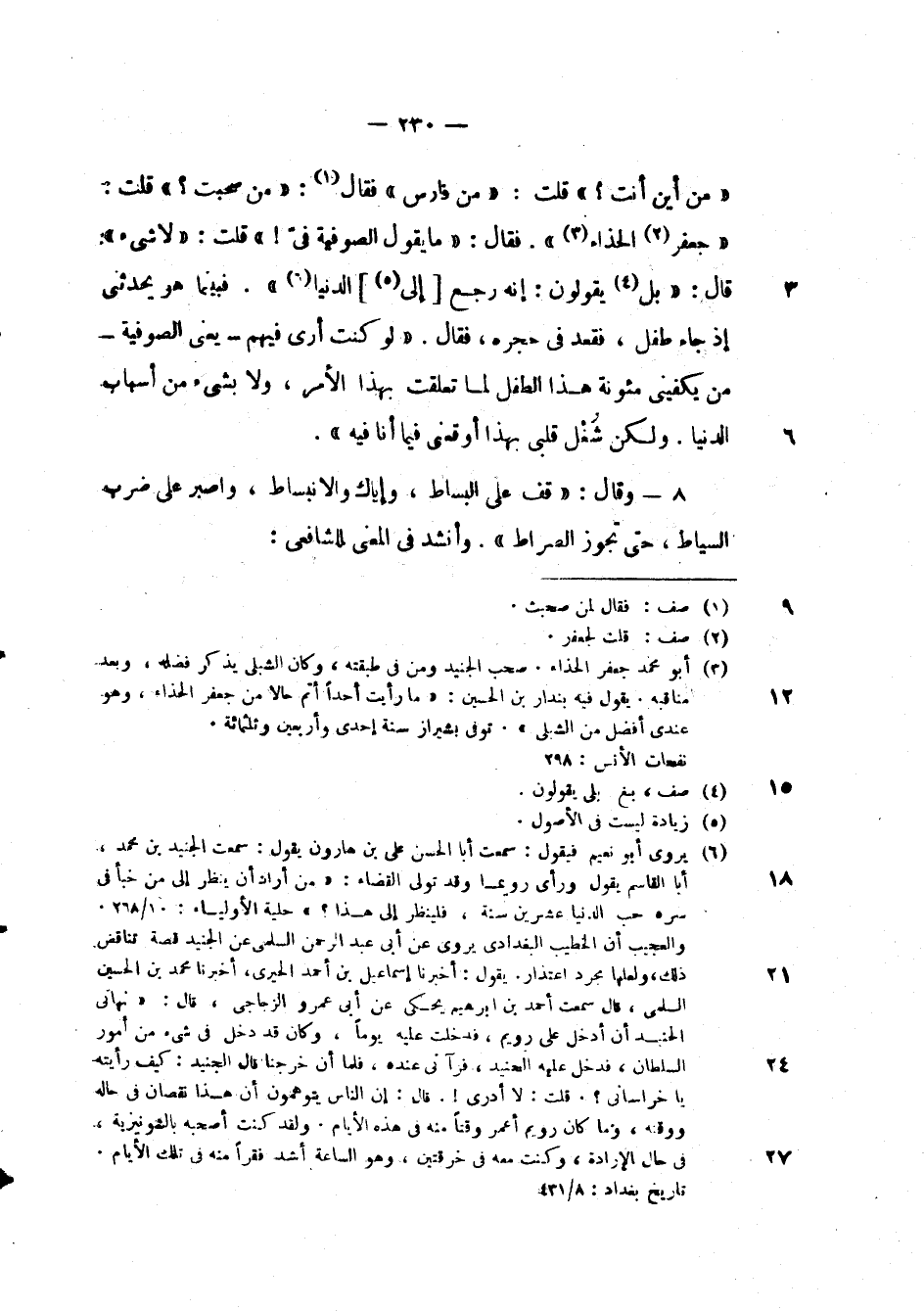 " من اين انت؟ " قلت: " من فارس " فقال: " من صحبت " قلت: " جعفر الحذاء ". فقال: " ما يقول الصوفية في! " قلت: " لا شيء " قال: " بل يقولون: إنه رجع إلى الدنيا ". فينما هو يحدثني إذ جاء طفل، فقعد في حجره، فقال: " لو كنت ارى فيهم - يعني الصوفية - من يكفيني مئونة هذا الطفل لما تعلقت بهذا الامر، ولا بشيء من اسباب الدنيا. ولكن شُغْل قلبي بهذا اوقعني فيما انا فيه ".