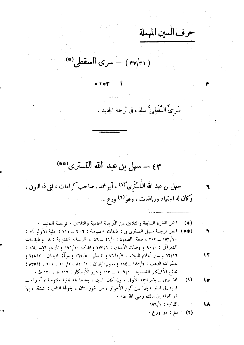 سهل بن عبد الله التَستَرِي، أبو محمد. صاحب كرامات، لقي ذا النون وكان له اجتهاد ورياضات، وهو ورع.