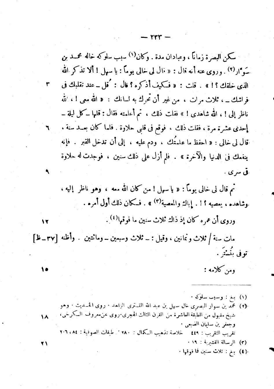 ثم قال لى خالي يوماً: " يا سهل! من كان الله معه، وهو ناظر اليه، وشاهده، يعصيه؟!. إياك والمعصية ". فكان ذلك اول أمره.