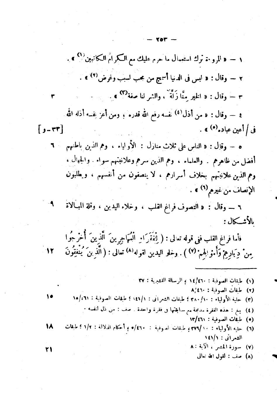 وقال: " التصوف فراغ القلب، وخلاء اليدين، وقلة المبالاة بالأشكال: فأما فراغ القلب ففي قوله تعالى:) للفقراء المهاجرين الذين أخرجوا من ديارهم وأموالهم (. وخلو اليدين لقوله تعالى:) الذين ينفقون