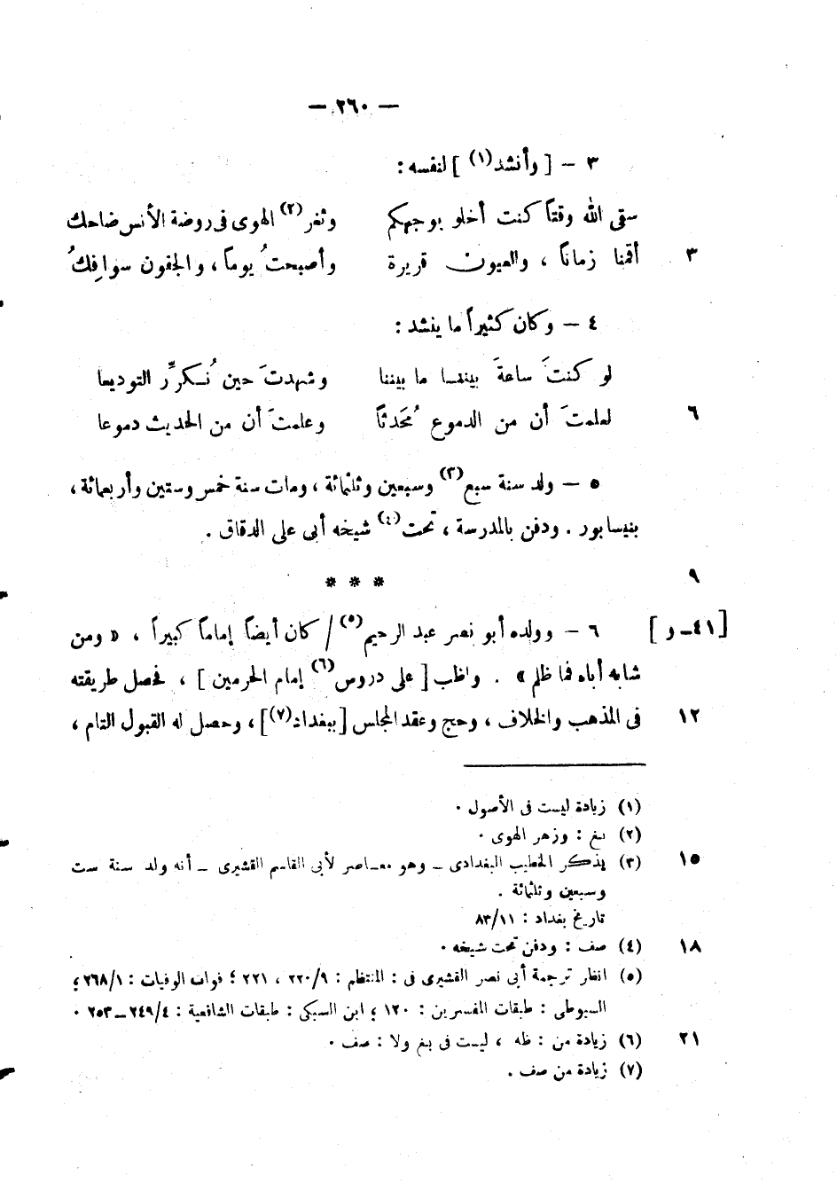 ولد سنة سبع وسبعين وثلثمائة، ومات سنة خمس وستين والأبعمائة، بنيسأبور. ودفن بالمدرسة، تحت شيخه أبى على الدقاق.